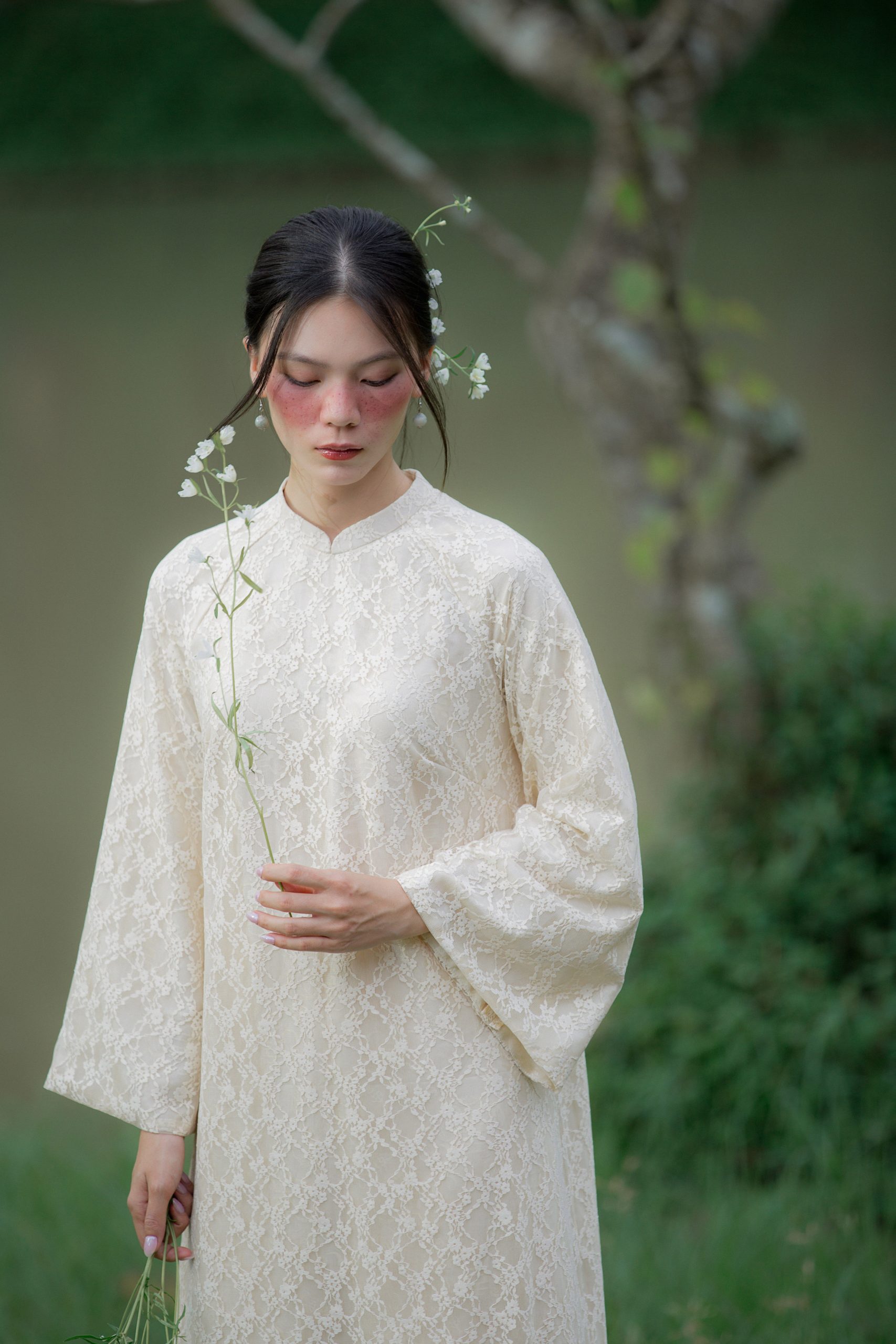Áo dài tơ tằm hoa Thuỷ Tiên màu xanh lục bảo