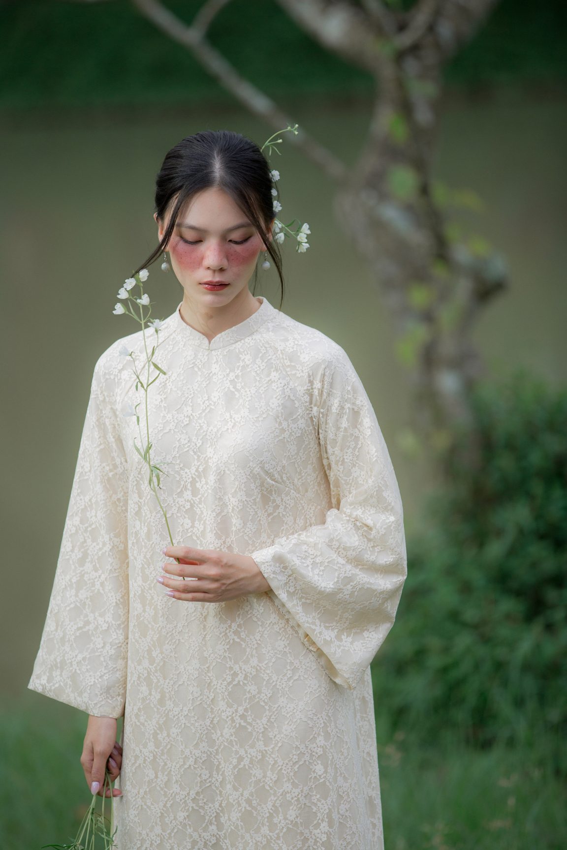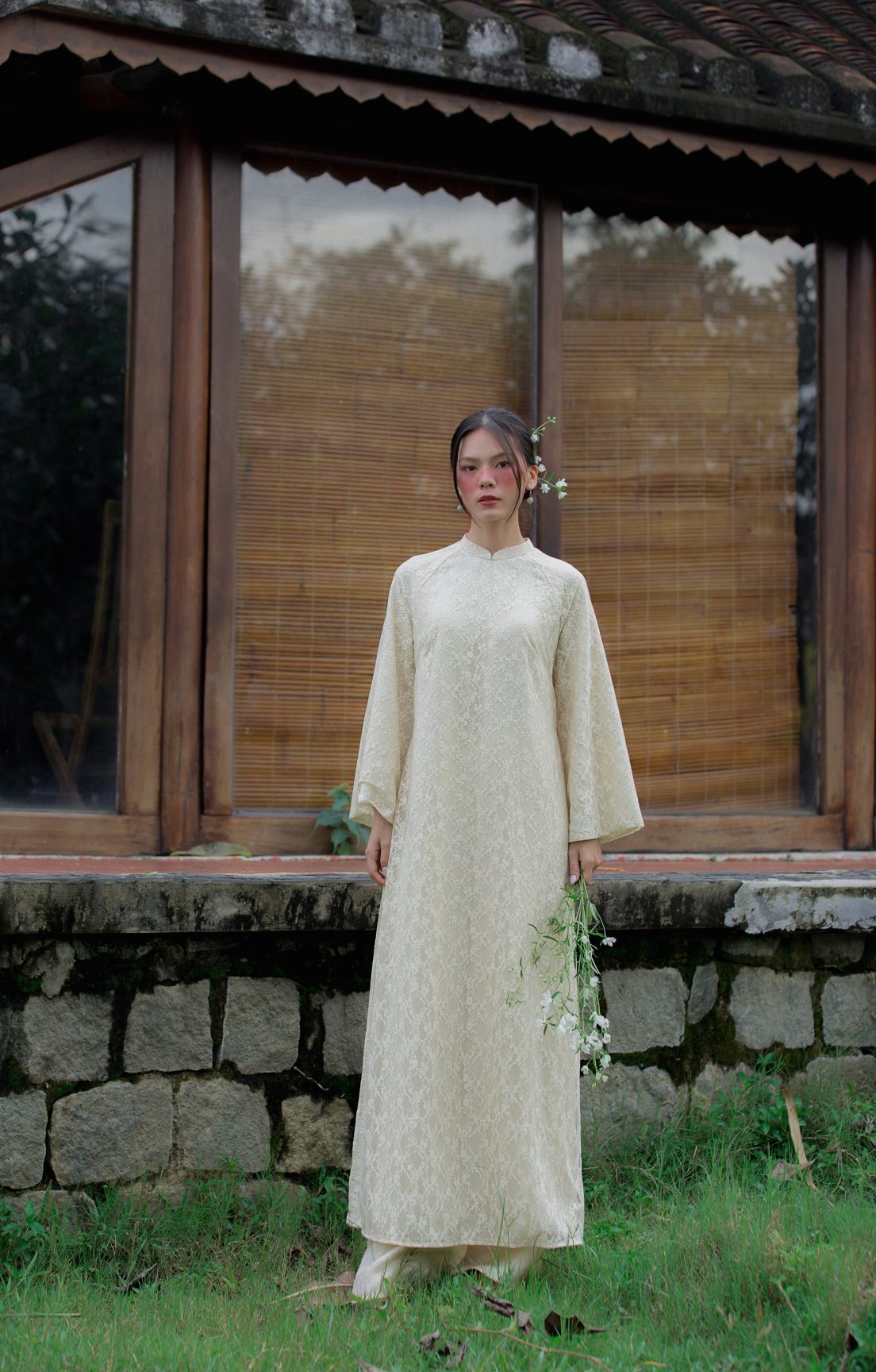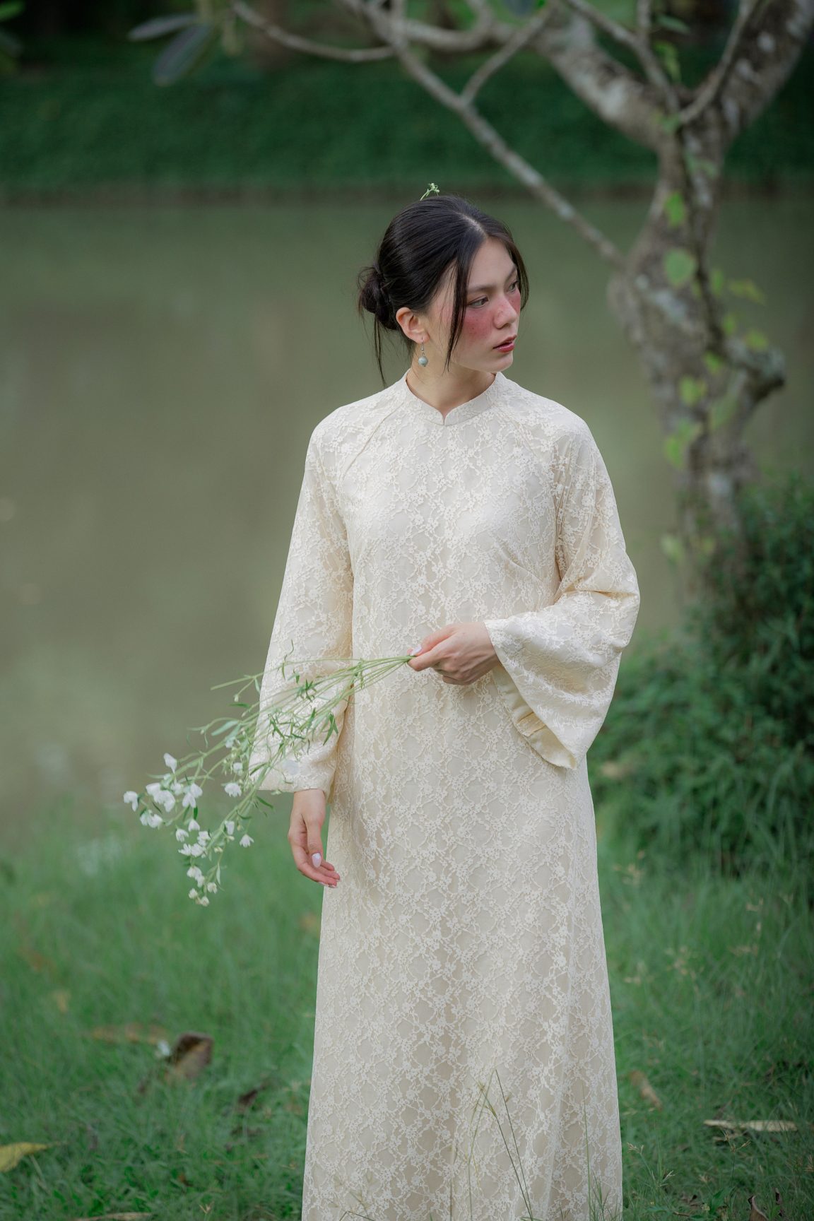 Áo dài An Nghi mang theo tinh thần an tĩnh và thuần khiết, tựa một làn gió dịu khẽ chạm vào những ngày đẹp nhất. Lớp hoa ren phủ nhẹ tạo cảm giác mong manh mà thanh tao, hòa cùng sắc kem hiền hòa để làm bật lên nét mềm mại của người mặc. Mỗi bước chân đều trở nên bồng bềnh, nhẹ bẫng như chuyển động của sự an yên. Một thiết kế kể chuyện bằng vẻ đẹp tinh khôi – giản dị, sâu lắng và đầy trang nhã.