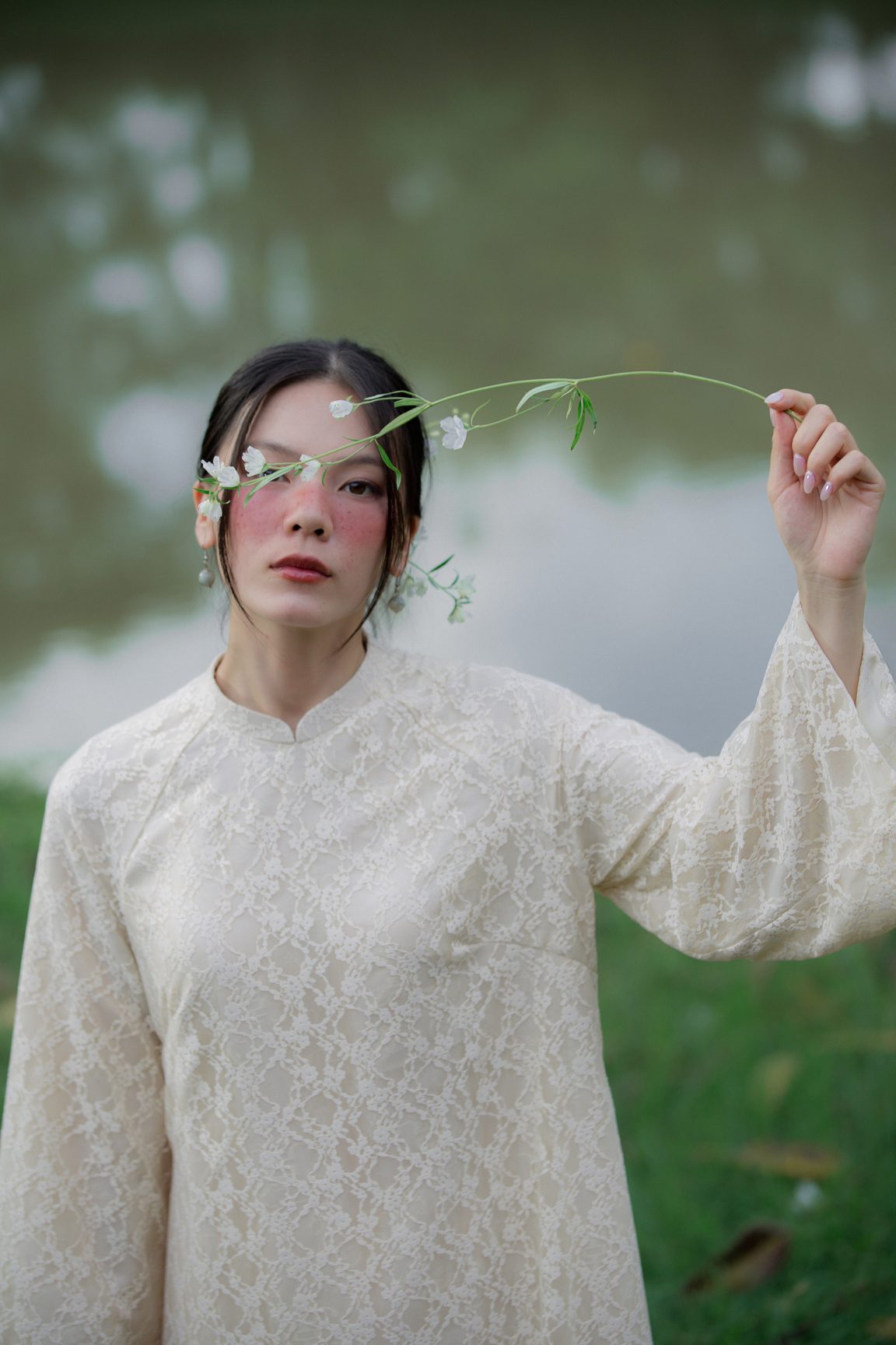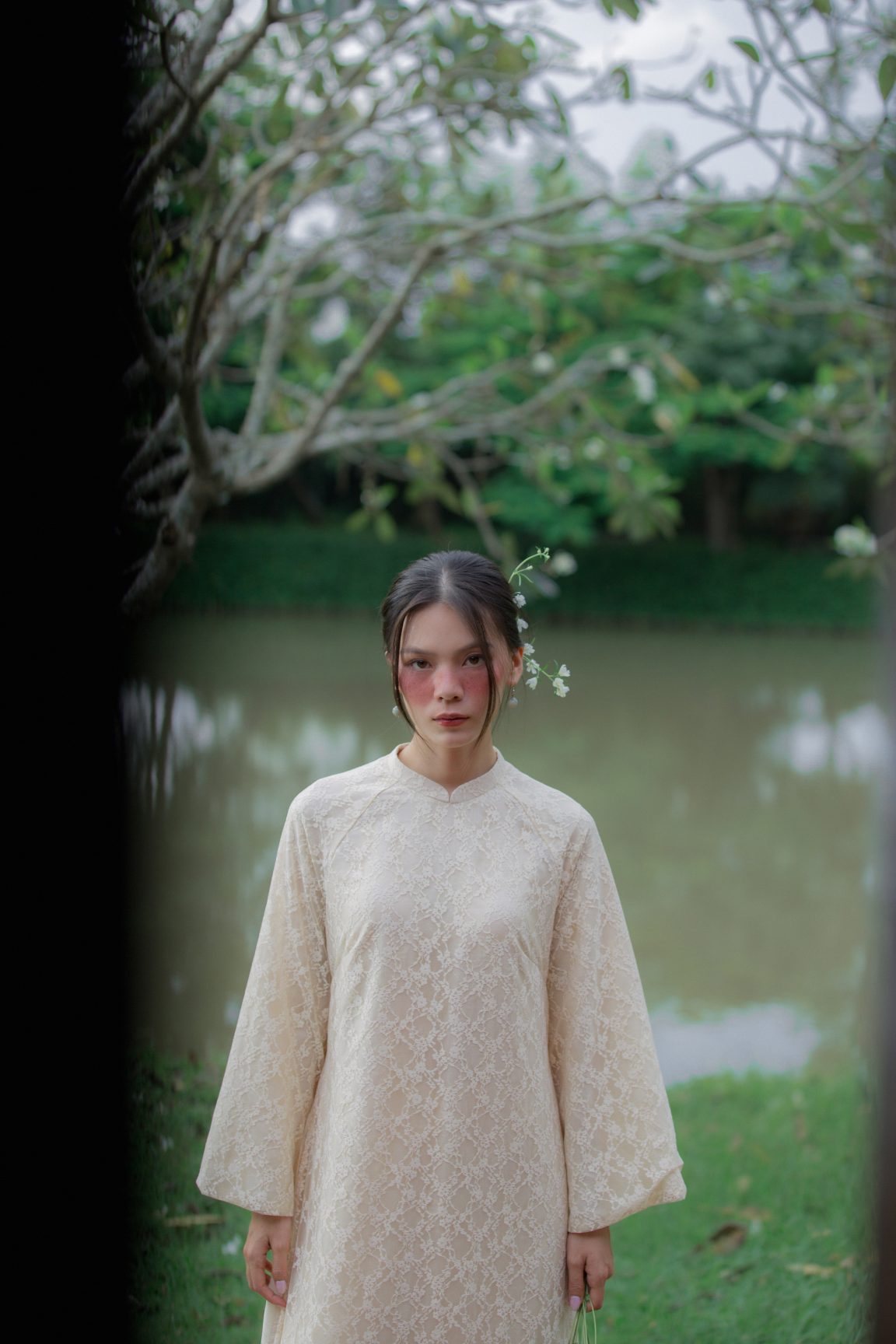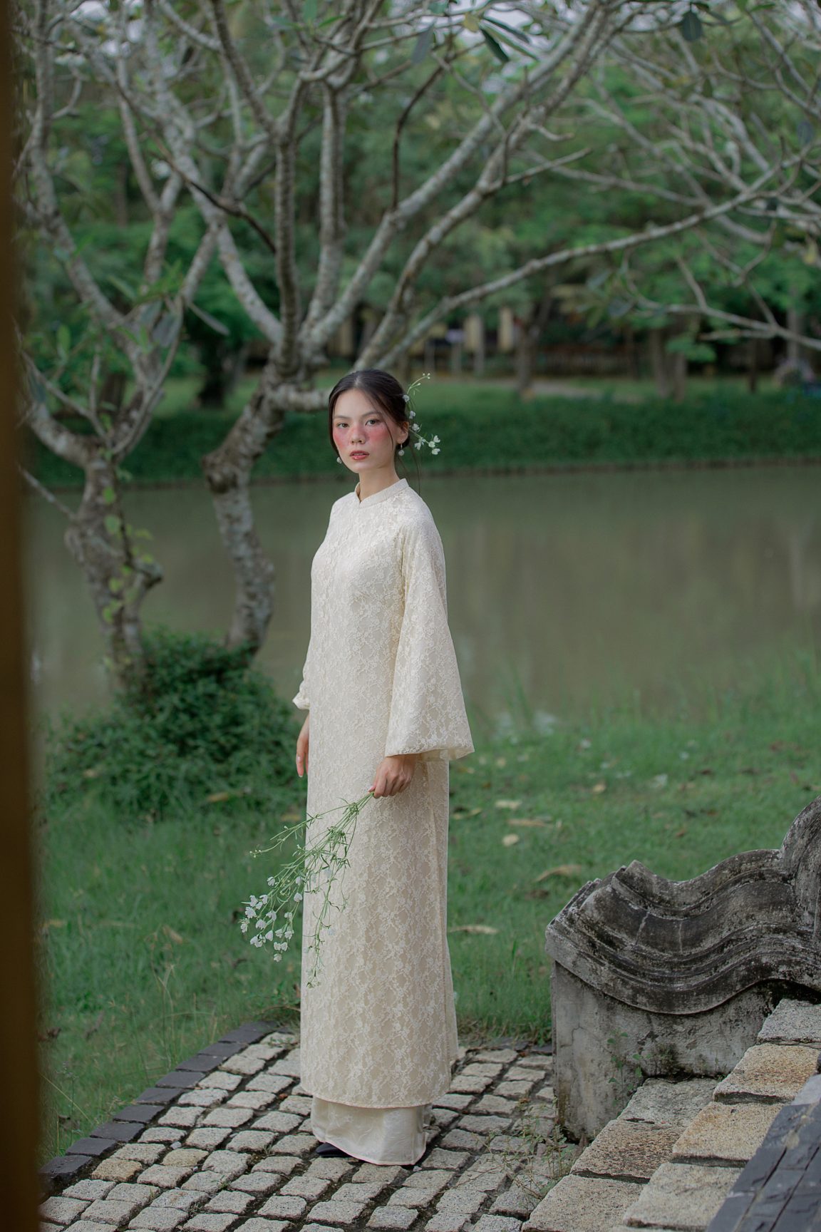 Áo dài An Nghi mang theo tinh thần an tĩnh và thuần khiết, tựa một làn gió dịu khẽ chạm vào những ngày đẹp nhất. Lớp hoa ren phủ nhẹ tạo cảm giác mong manh mà thanh tao, hòa cùng sắc kem hiền hòa để làm bật lên nét mềm mại của người mặc. Mỗi bước chân đều trở nên bồng bềnh, nhẹ bẫng như chuyển động của sự an yên. Một thiết kế kể chuyện bằng vẻ đẹp tinh khôi – giản dị, sâu lắng và đầy trang nhã.