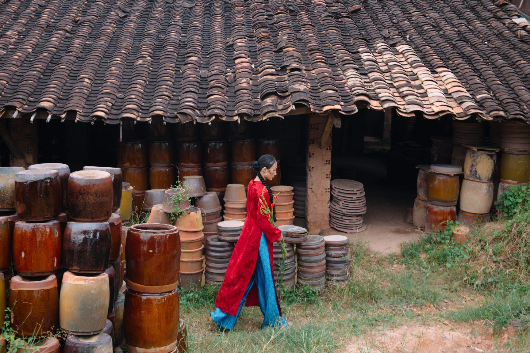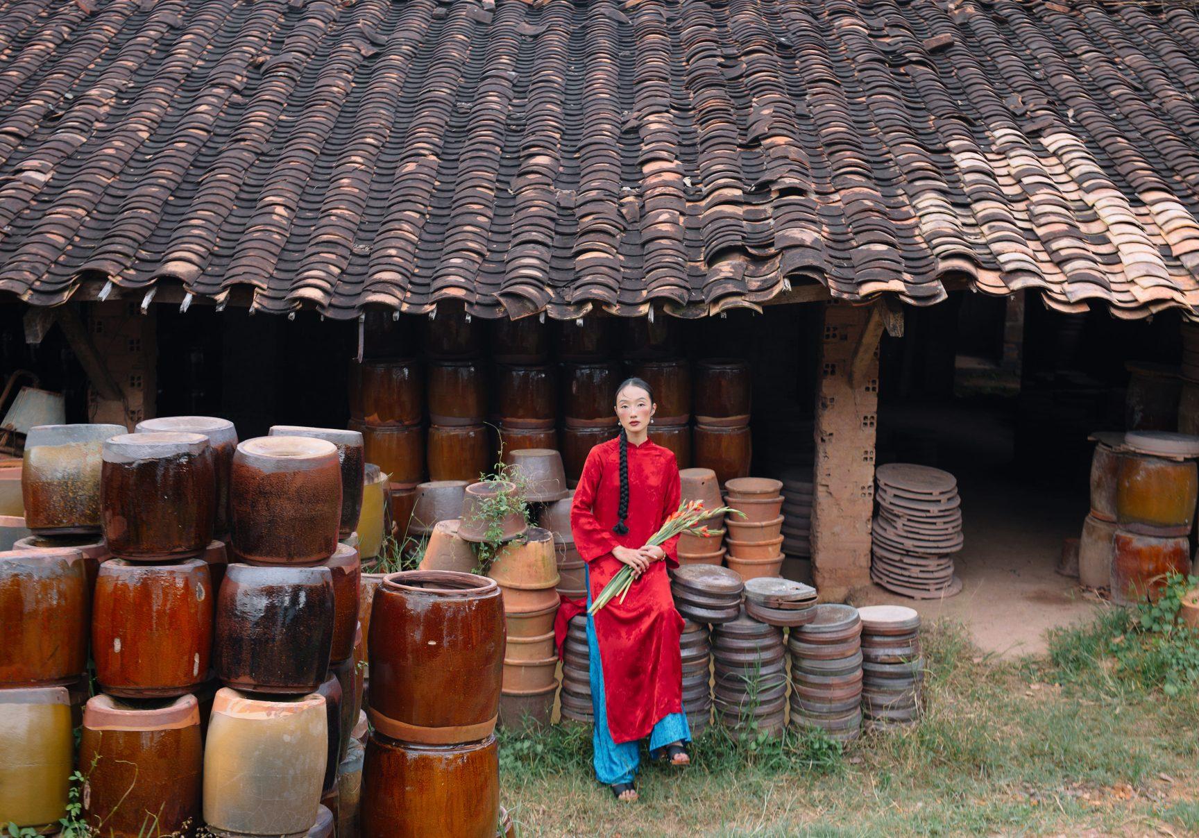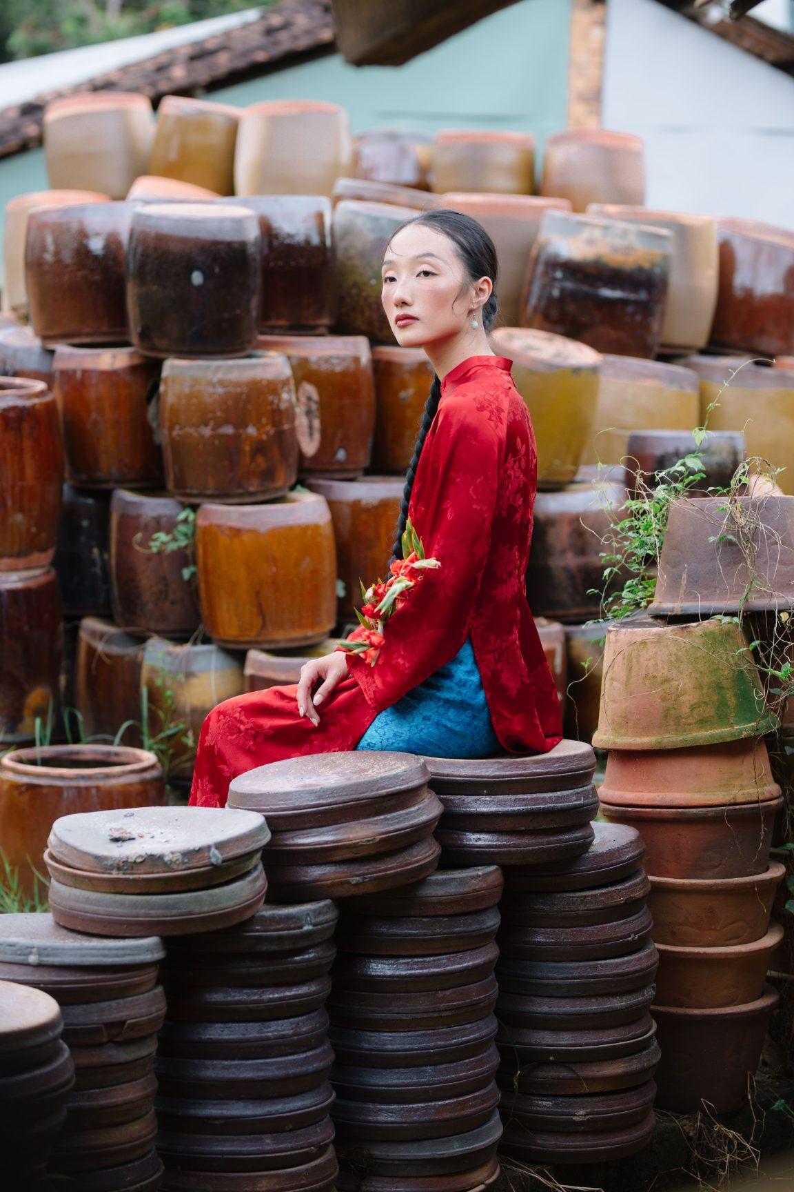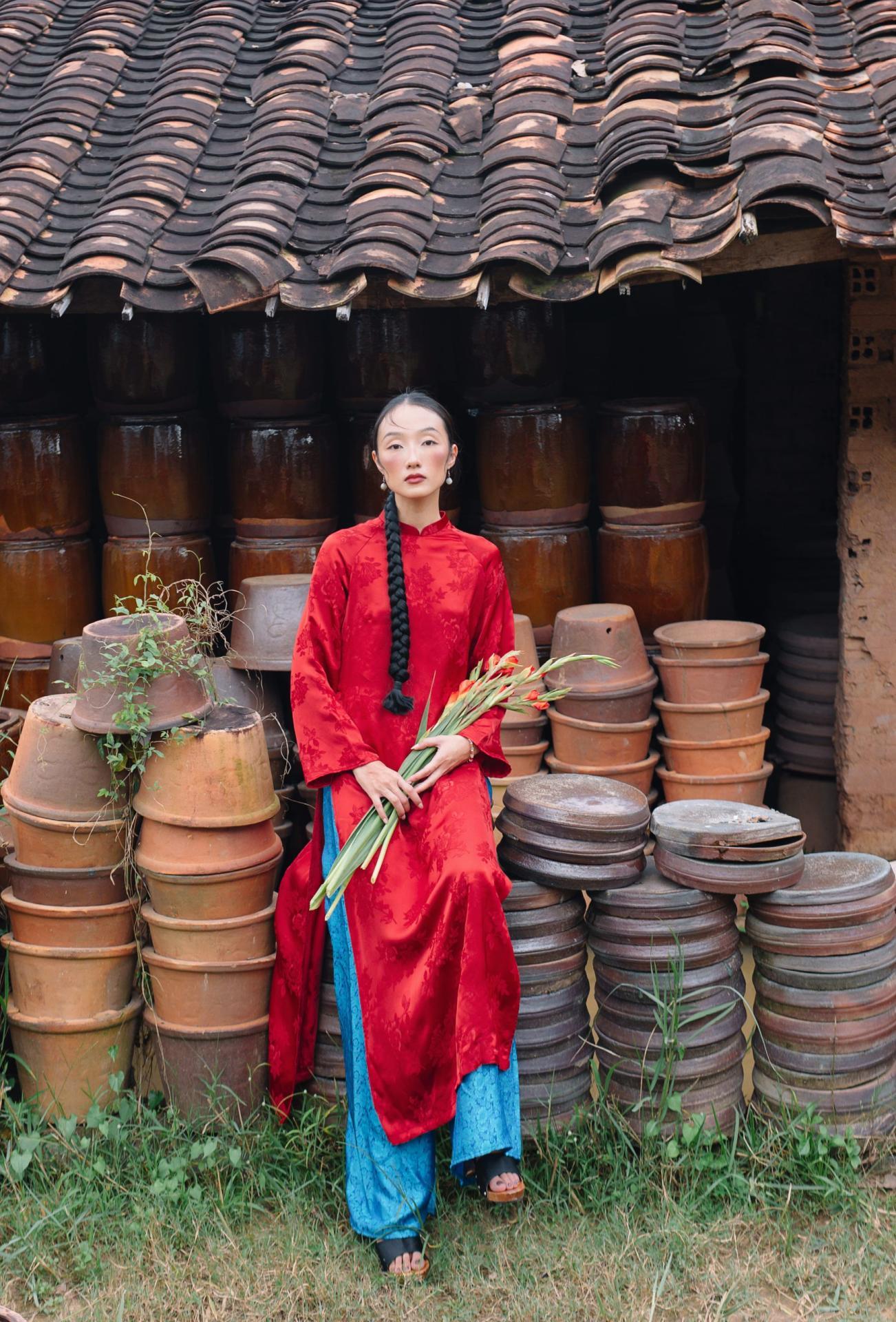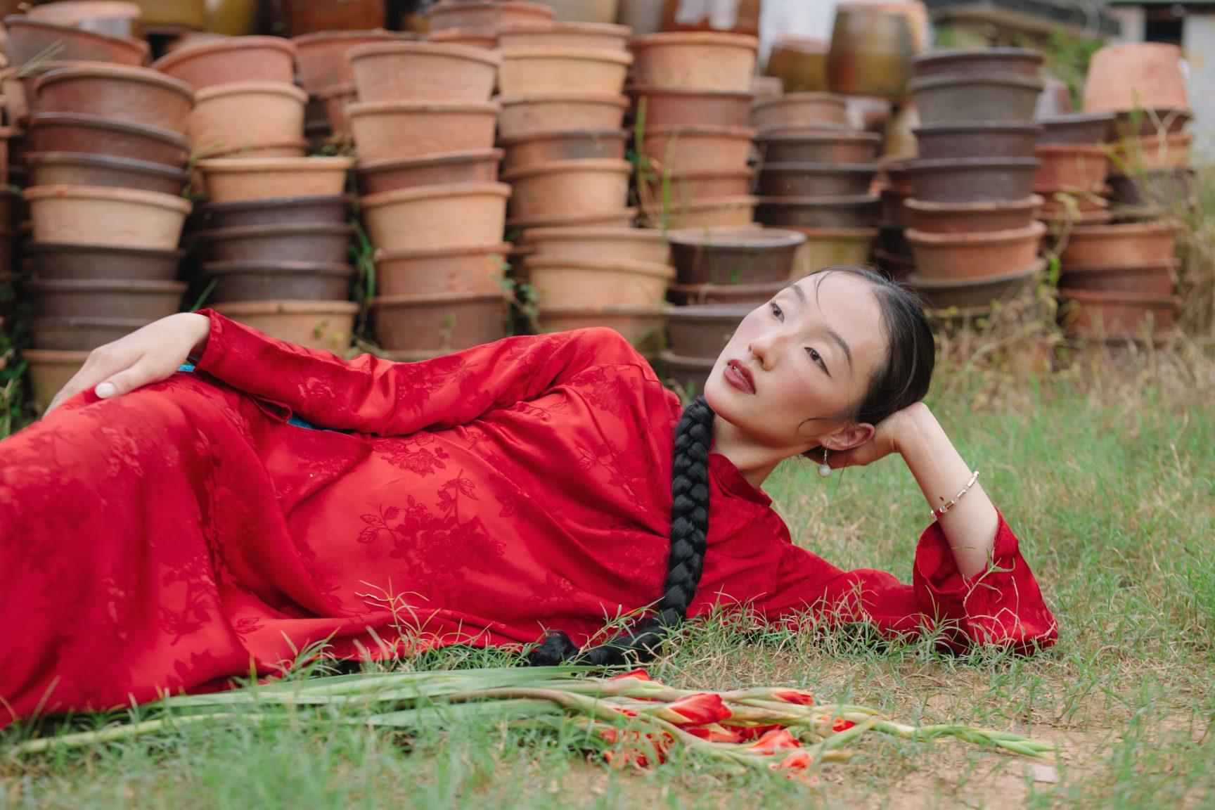 Áo dài lụa Hàng Châu Đỗ Quyên màu đỏ