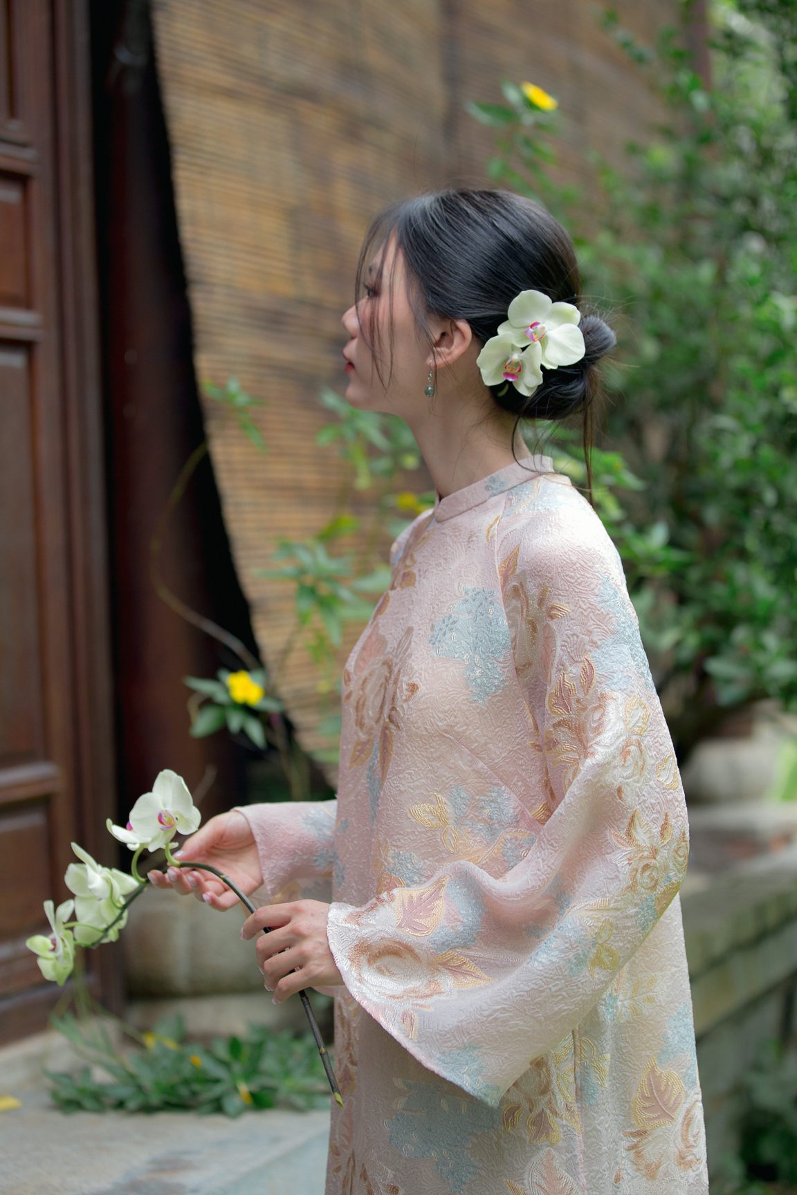 Tựa như làn gió thu khẽ chạm qua hiên nhà, áo dài Thu Hải Đường mang đến cảm giác dịu dàng và thanh thoát. Trên nền tơ silk ánh nhẹ, họa tiết hoa Thu Hải Đường được dệt tinh xảo, khẽ ẩn khẽ hiện như những cánh hoa trong nắng sớm vừa mềm mại, vừa an yên. Chất vải, nhẹ như hơi thở, buông rủ tự nhiên trên từng chuyển động. Thiết kế phom suông rộng tôn lên nét phóng khoáng mà vẫn giữ được vẻ nền nã, tinh khôi vốn có của nàng.