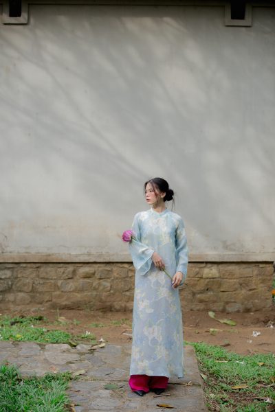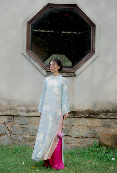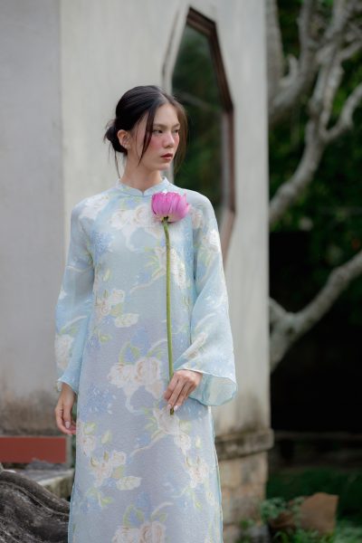 Tựa như làn gió thu khẽ chạm qua hiên nhà, áo dài Thu Hải Đường mang đến cảm giác dịu dàng và thanh thoát. Trên nền tơ silk ánh nhẹ, họa tiết hoa Thu Hải Đường được dệt tinh xảo, khẽ ẩn khẽ hiện như những cánh hoa trong nắng sớm vừa mềm mại, vừa an yên. Chất vải, nhẹ như hơi thở, buông rủ tự nhiên trên từng chuyển động. Thiết kế phom suông rộng tôn lên nét phóng khoáng mà vẫn giữ được vẻ nền nã, tinh khôi vốn có của nàng.