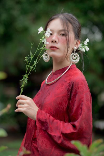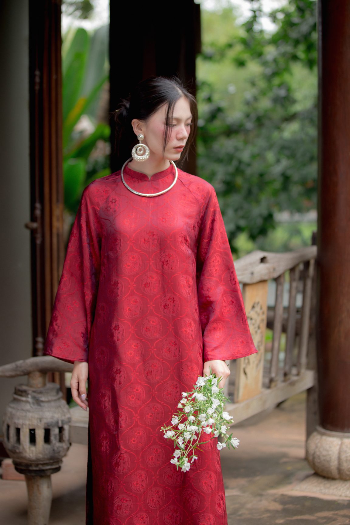 Áo dài tơ tằm hoa Thuỷ Tiên màu đỏ
