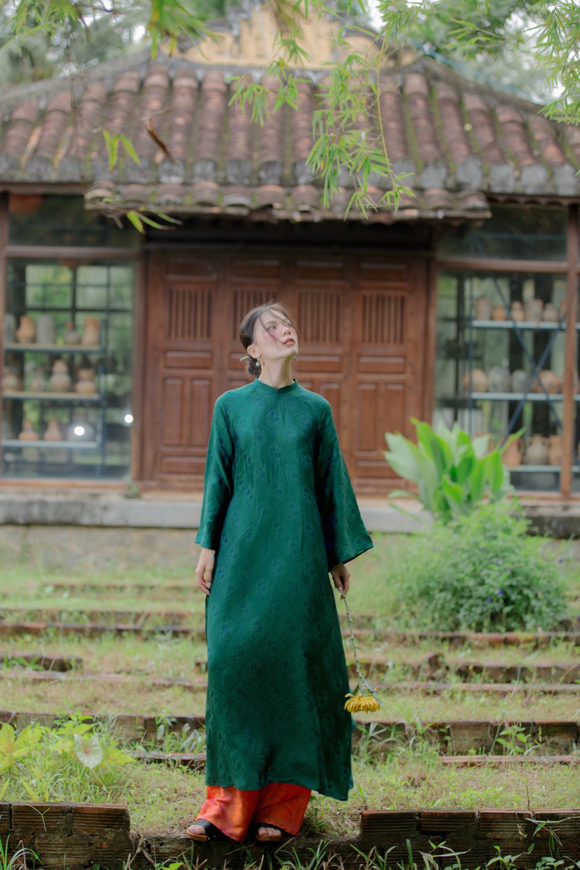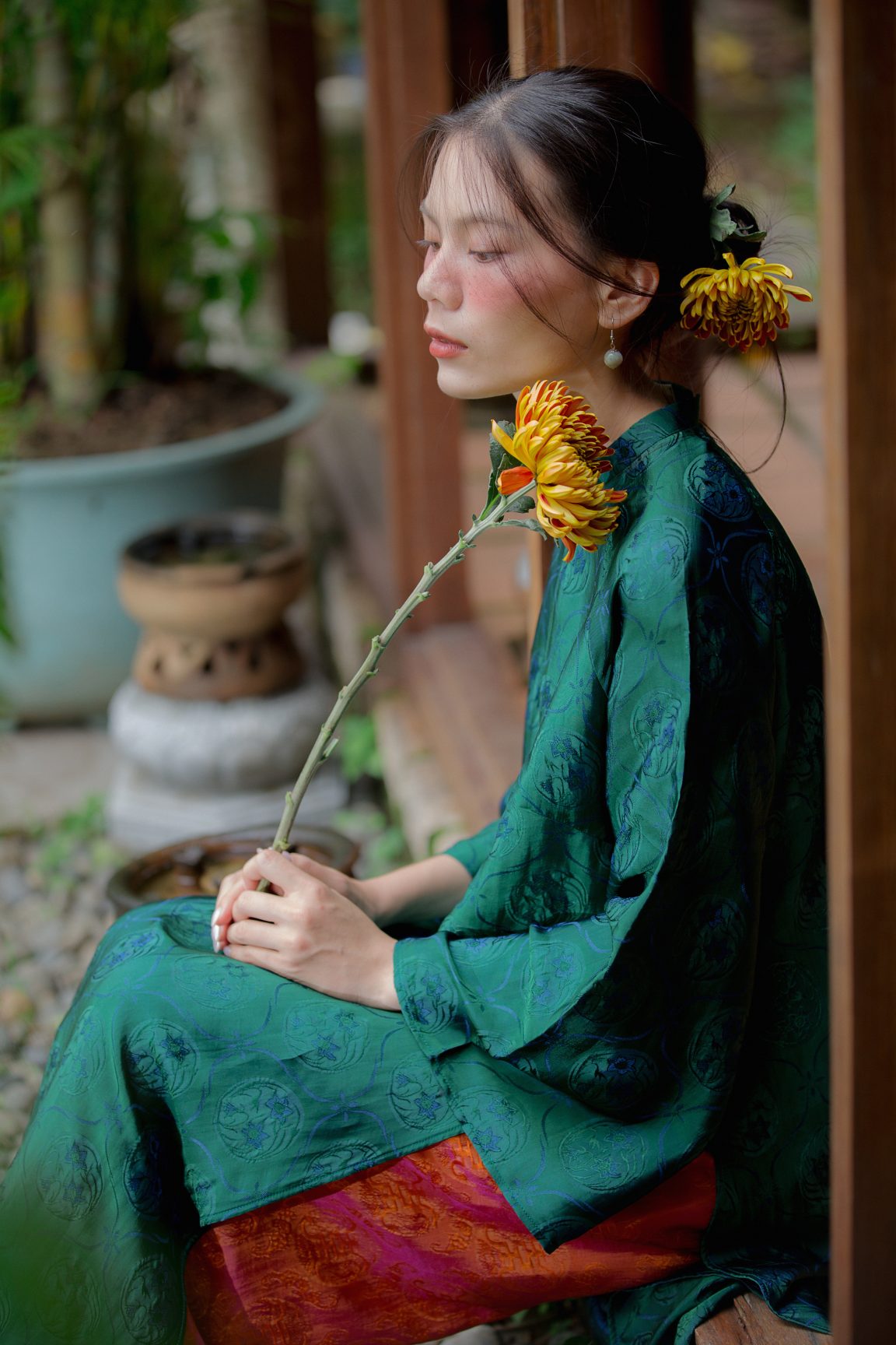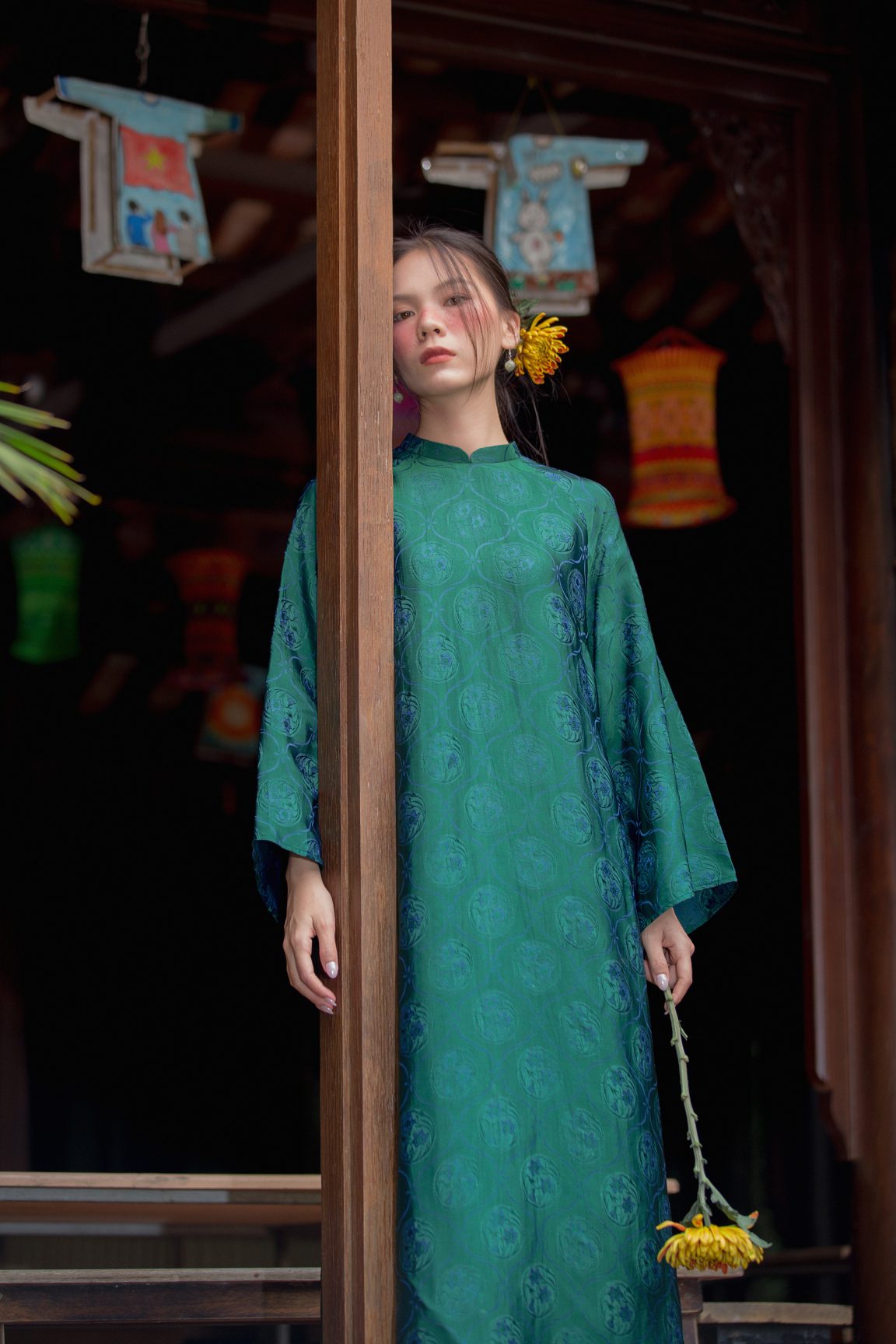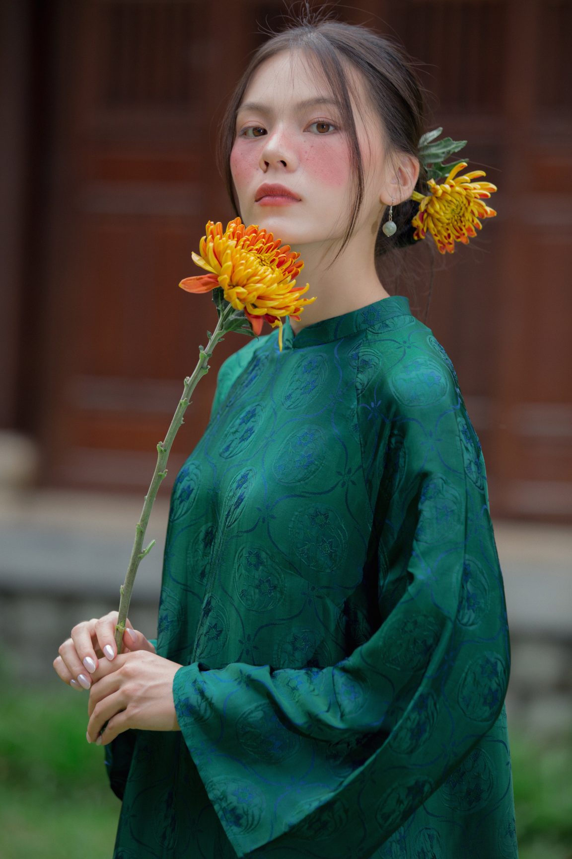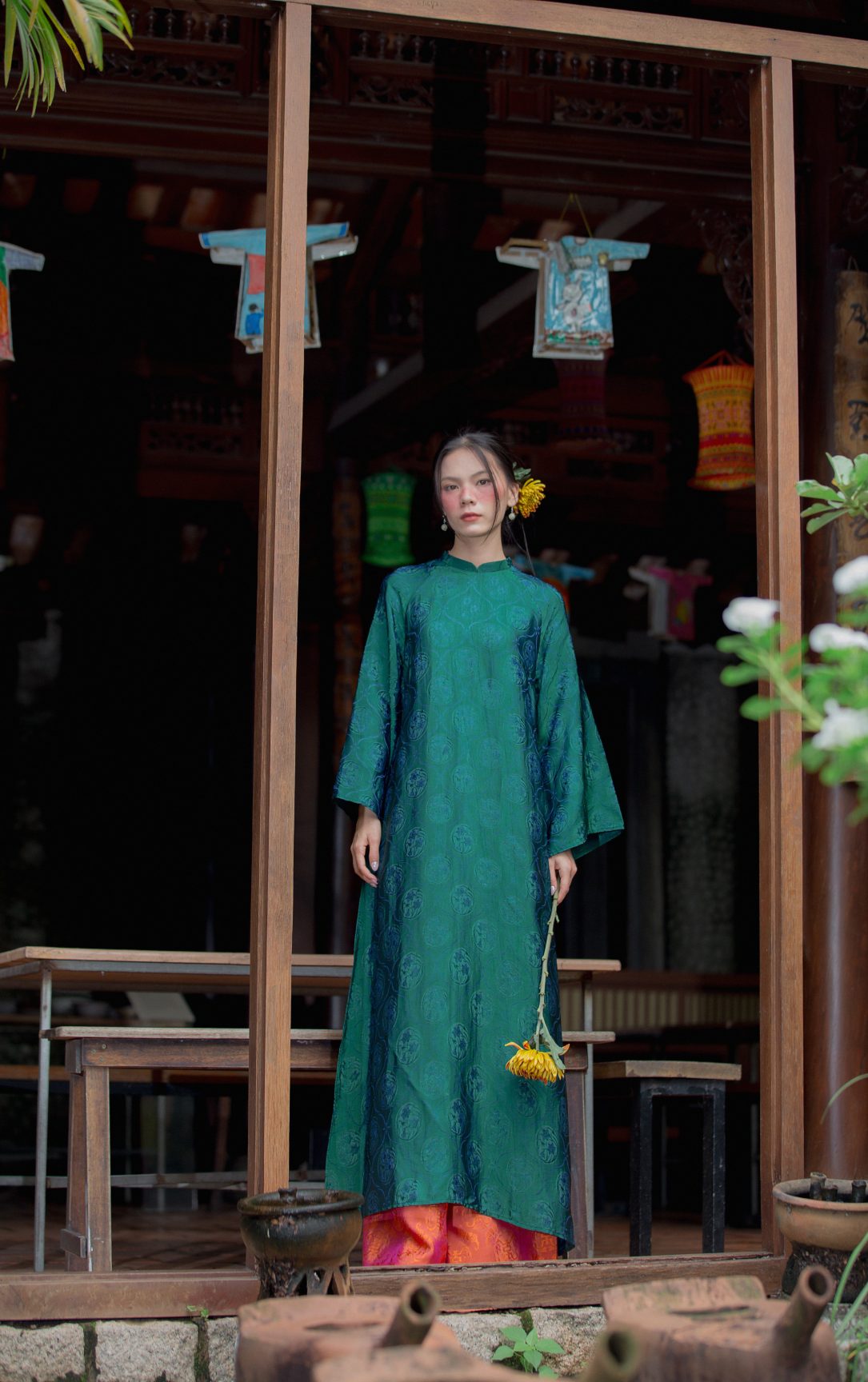 Áo dài tơ tằm hoa Thuỷ Tiên màu xanh lục bảo