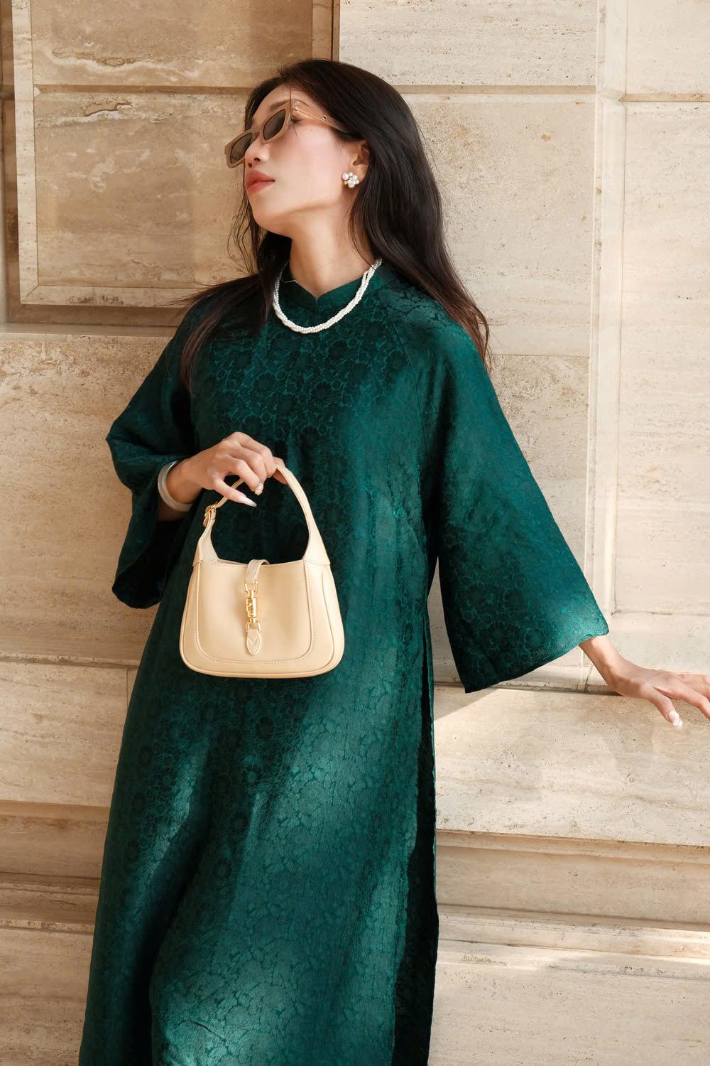 Áo dài tơ tằm hoạ tiết hoa cúc màu xanh lục bảo – dáng cách tân