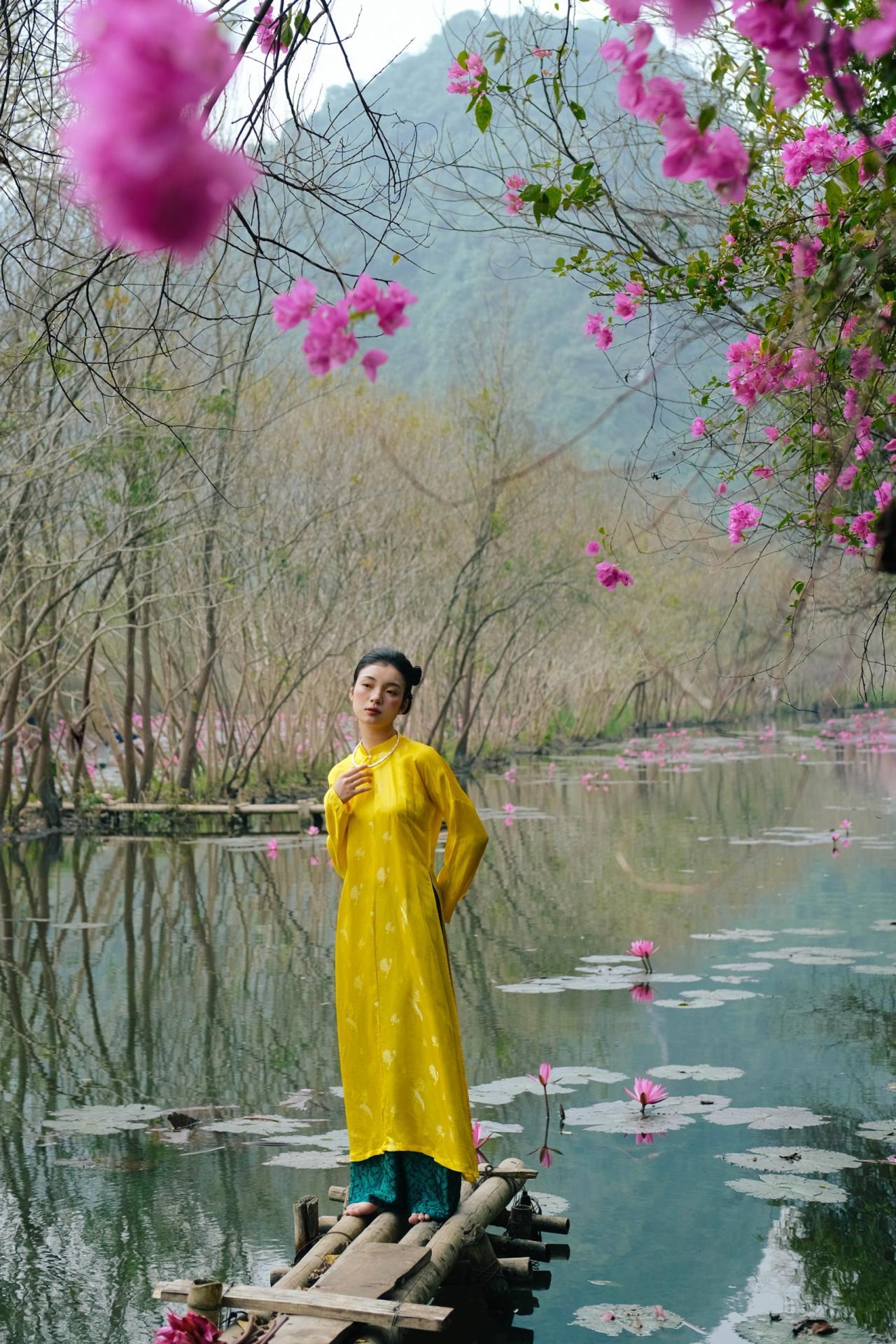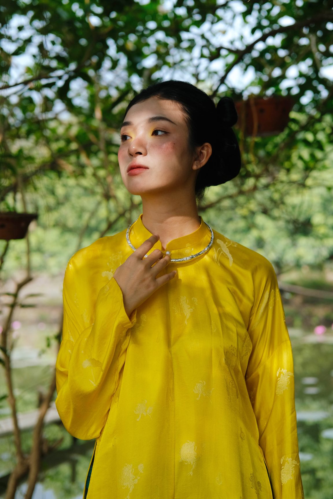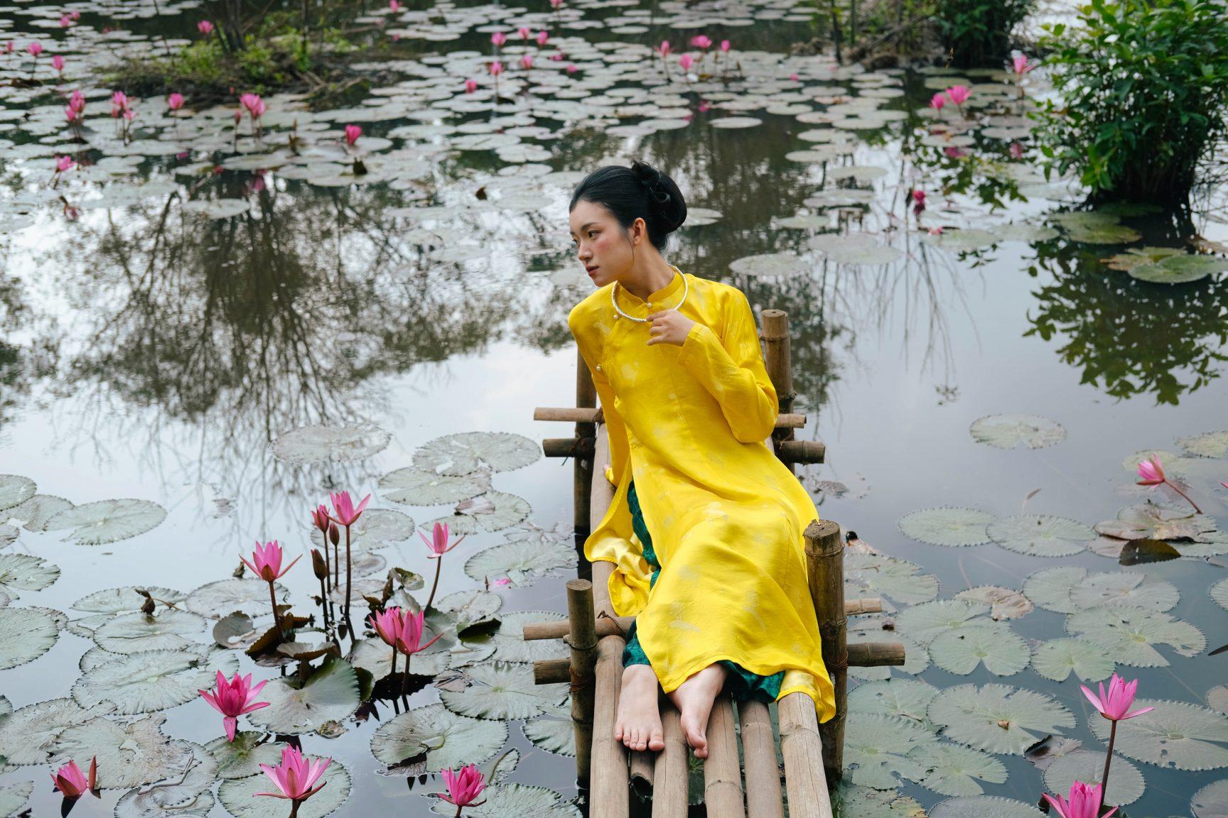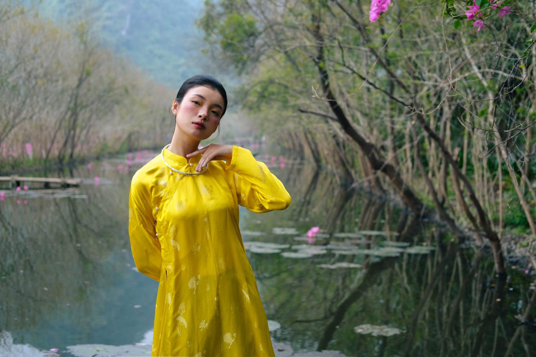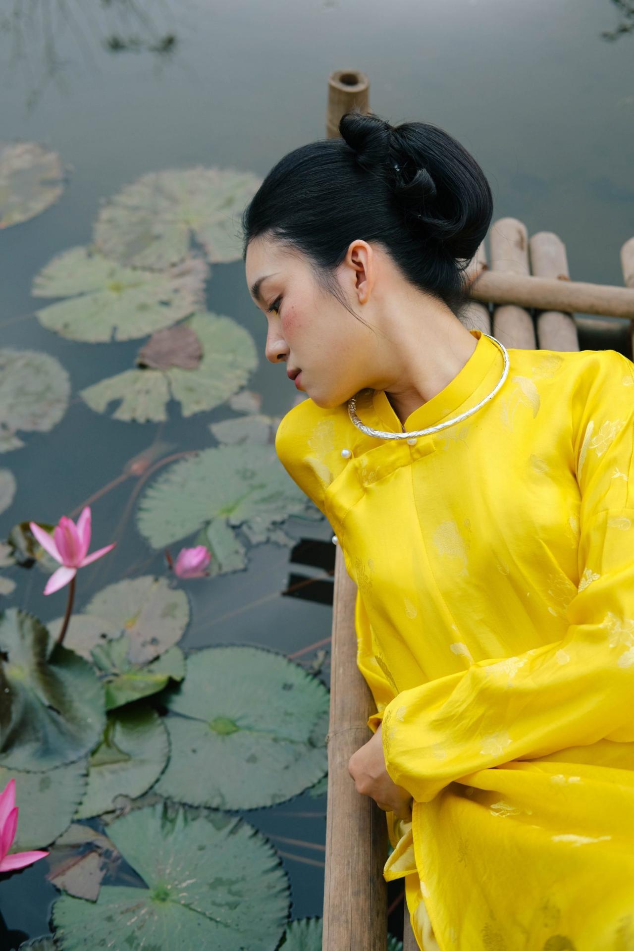 Áo dài tơ tằm hoạ tiết hoa sen màu vàng – dáng ngũ thân