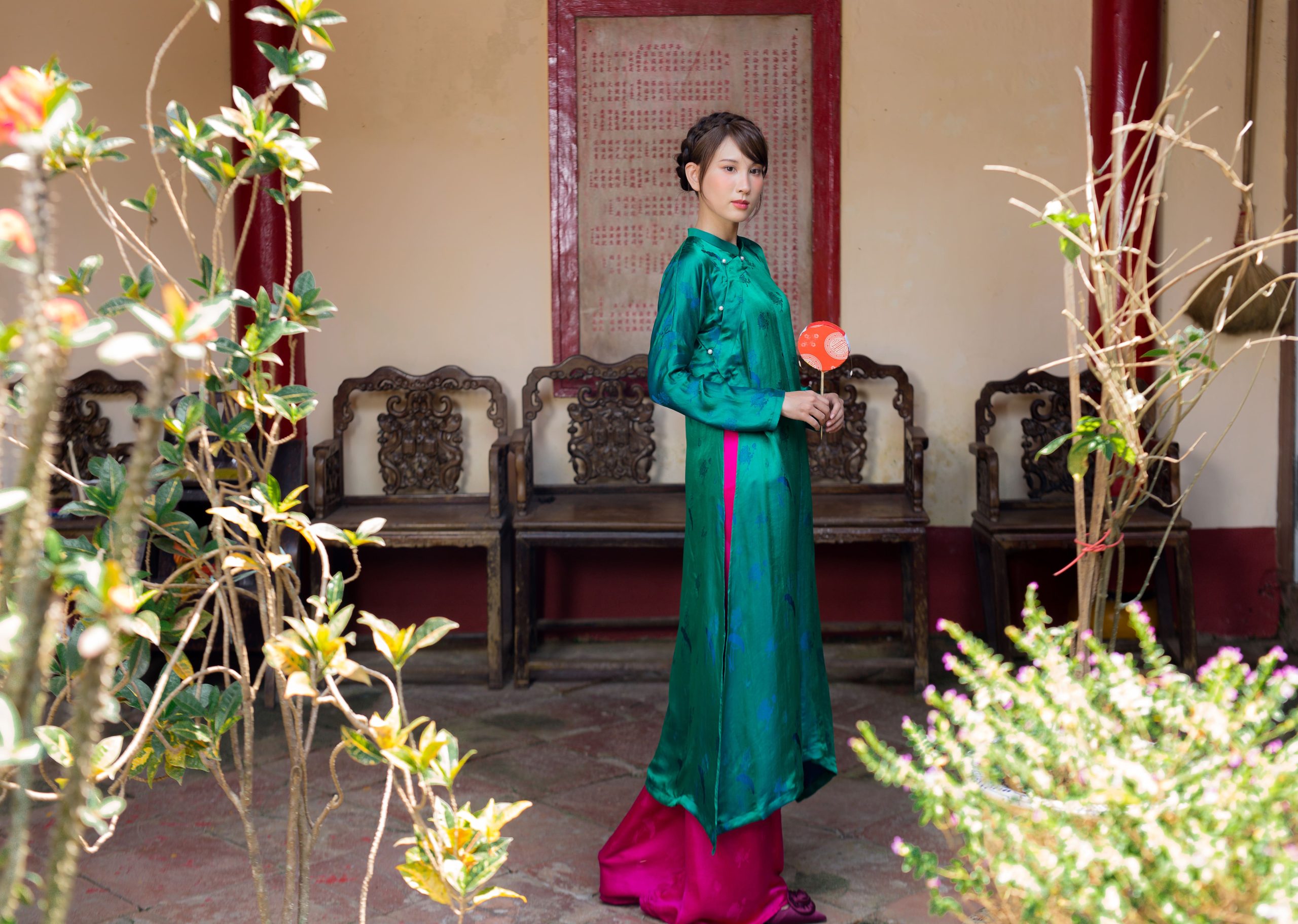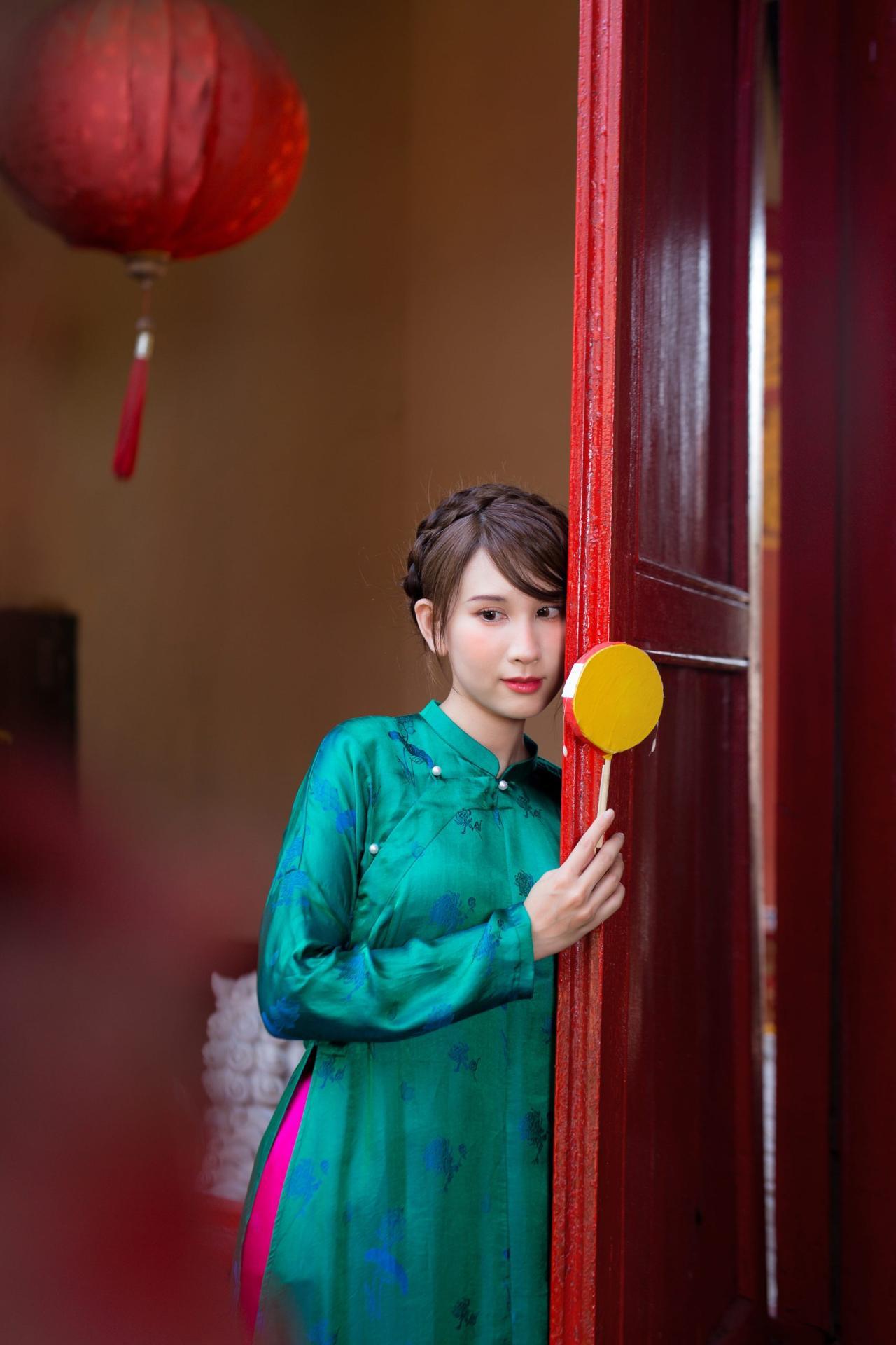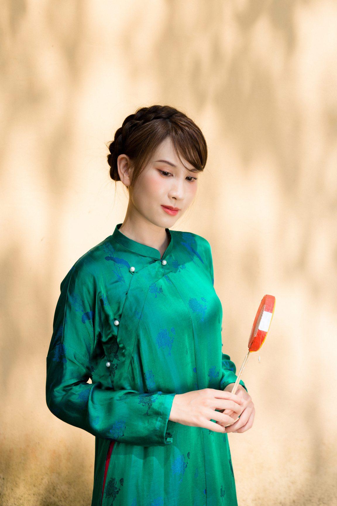 Áo dài tơ tằm hoạ tiết hoa sen màu xanh lá – dáng ngũ thân