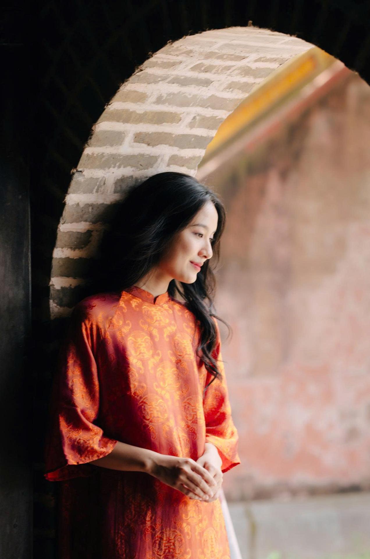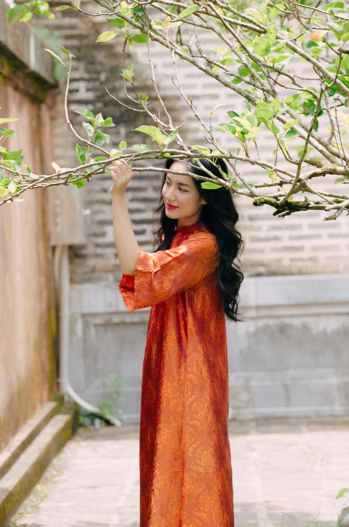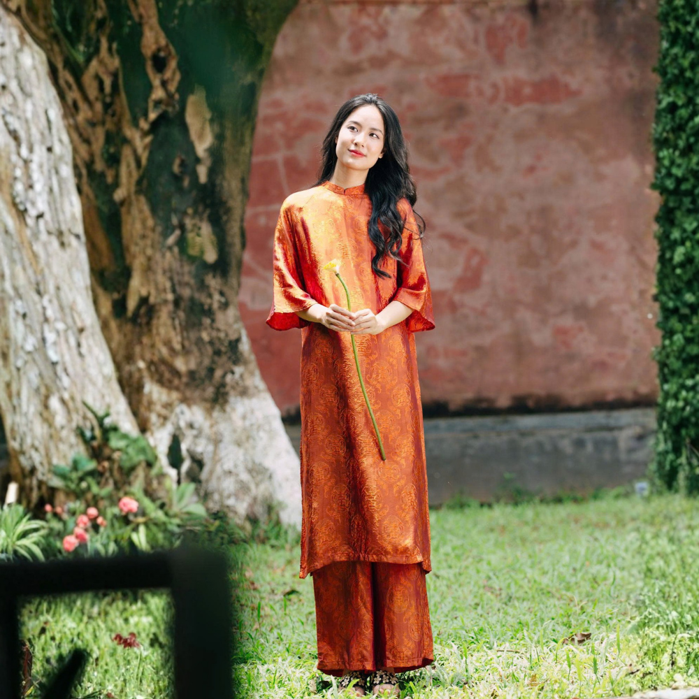Áo dài tơ tằm hoạ tiết thọ dơi màu cam – dáng cách tân