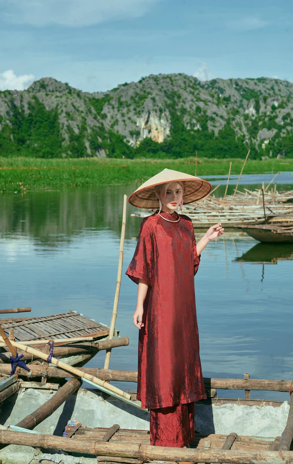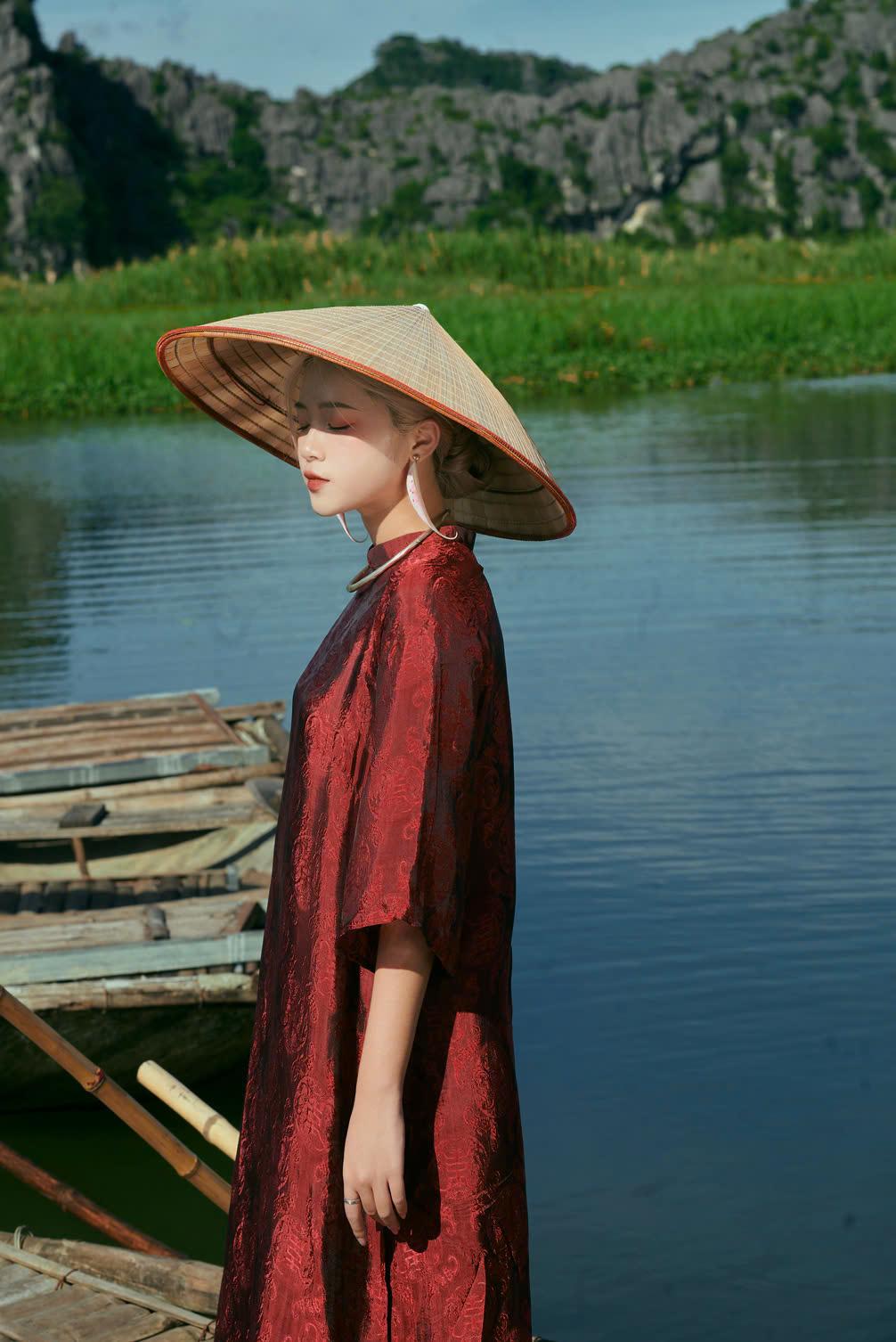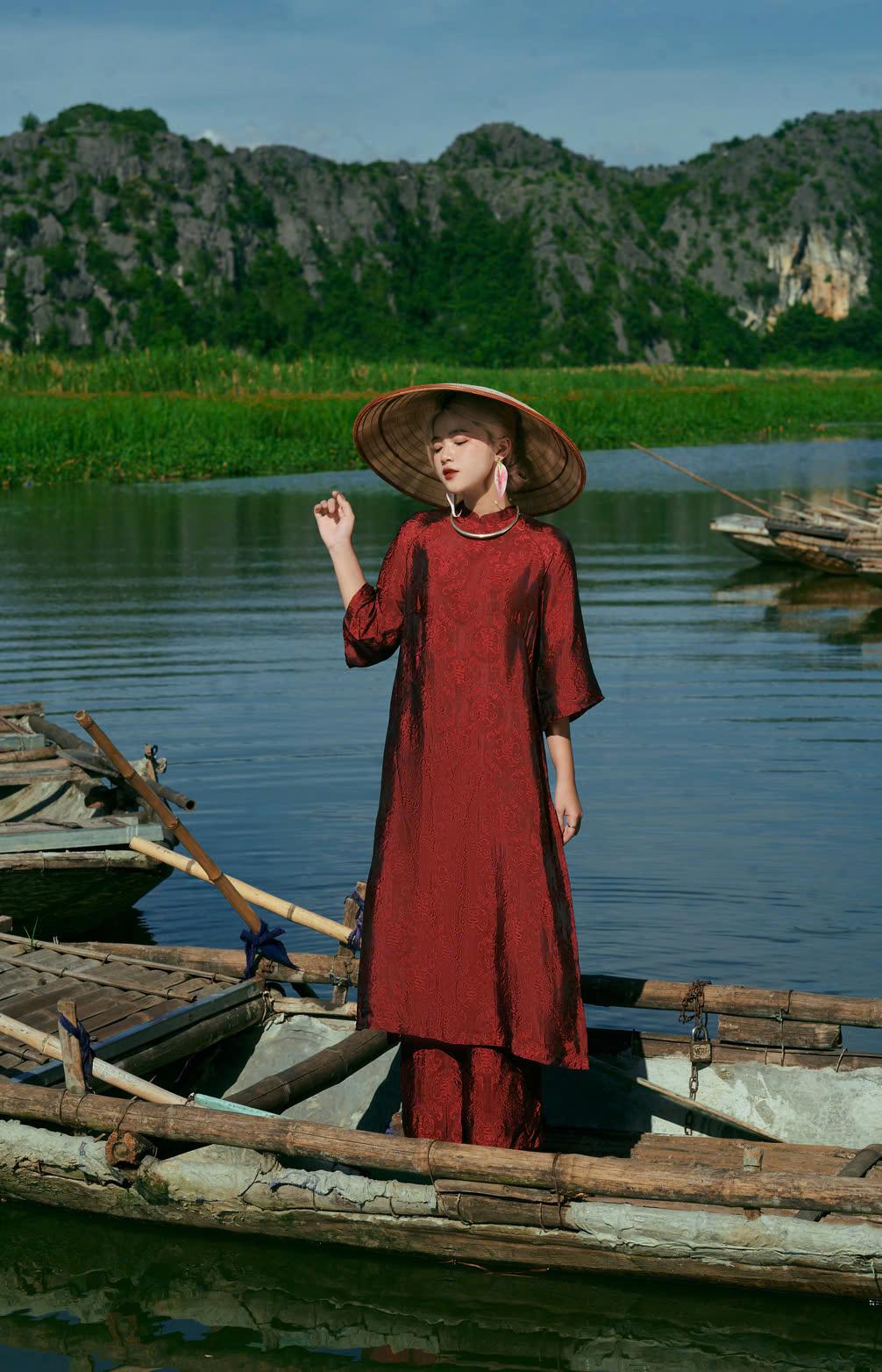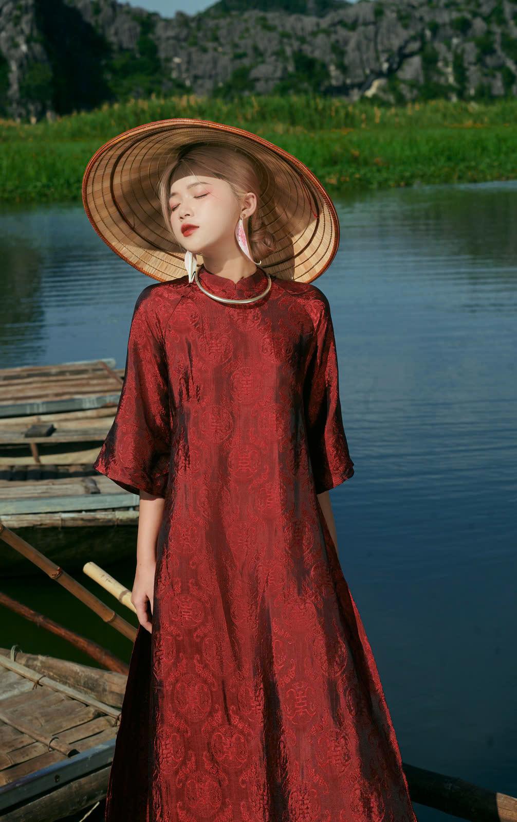 Áo dài tơ tằm hoạ tiết thọ dơi màu đỏ – dáng cách tân