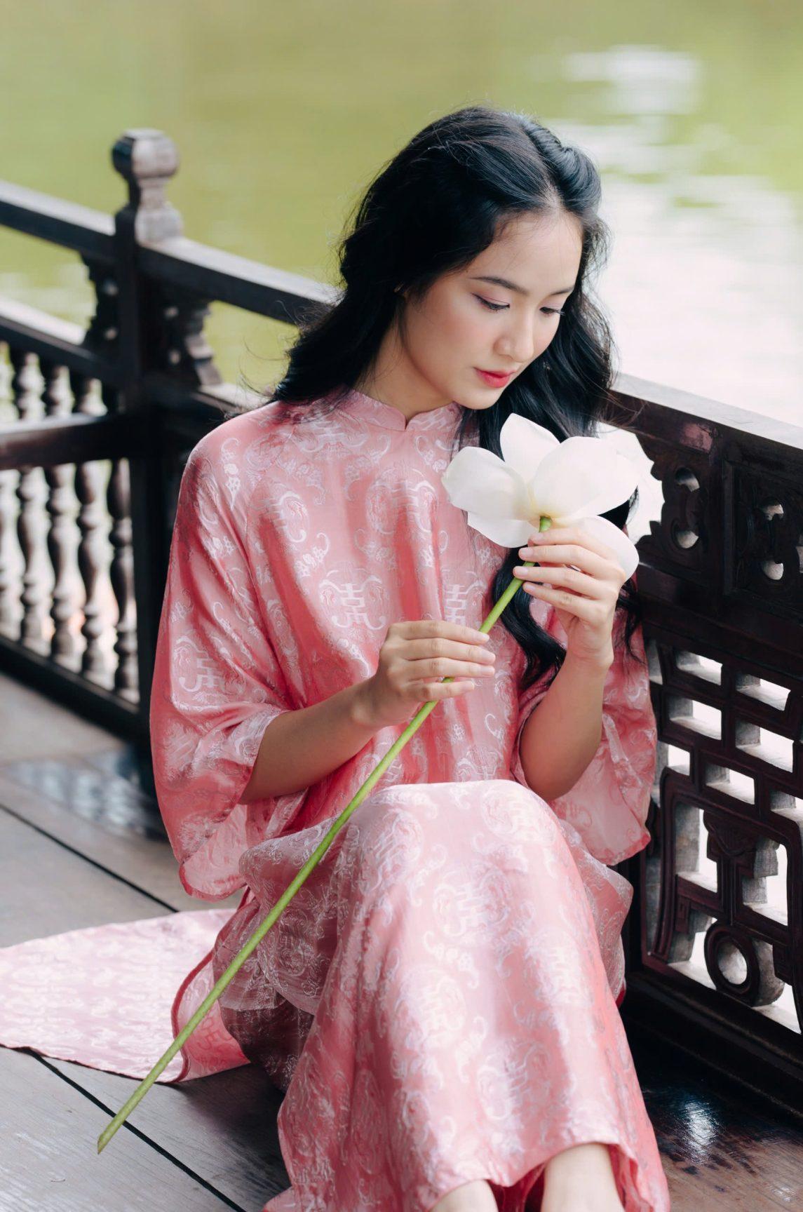 Áo dài tơ tằm hoạ tiết thọ dơi màu hồng tươi – dáng cách tân
