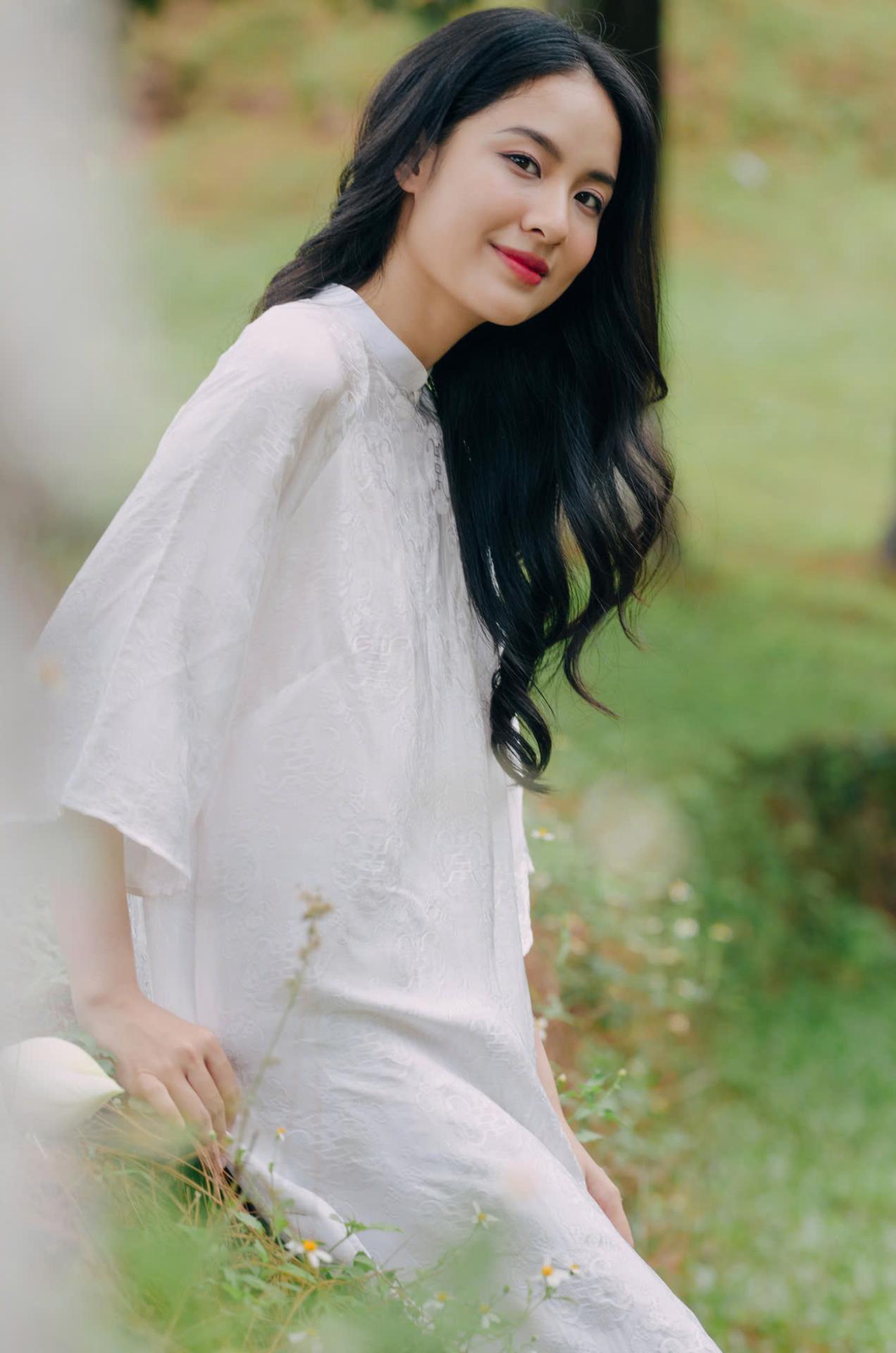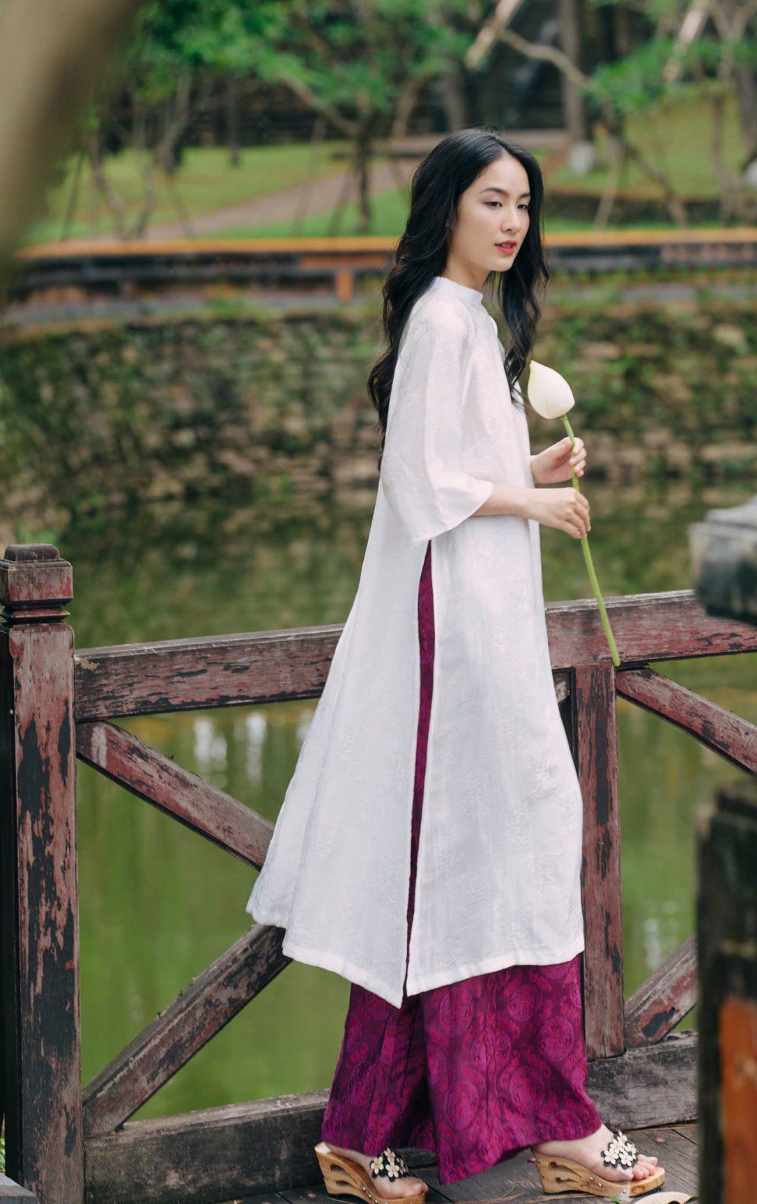 Áo dài tơ tằm hoạ tiết thọ dơi màu trắng – dáng cách tân