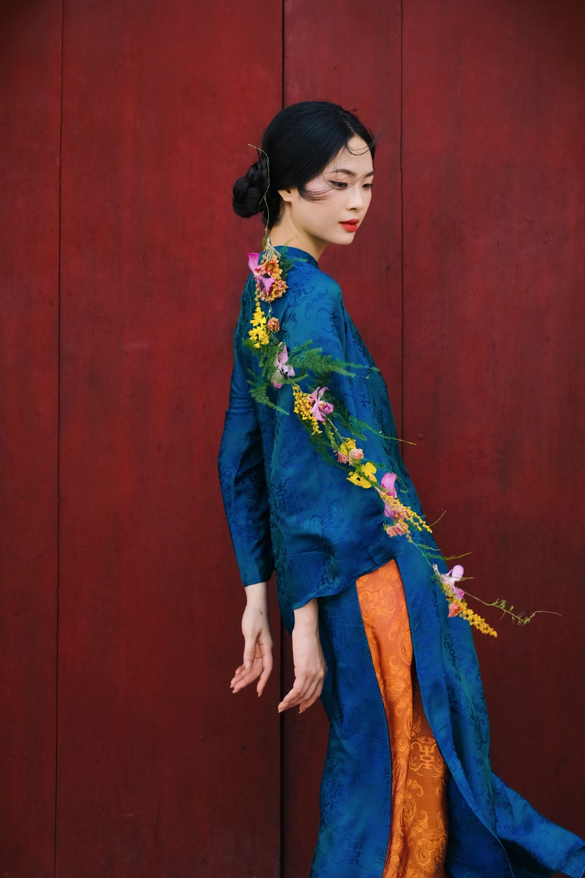 Phom quần suông thoải mái, chuyển động mềm theo bước chân, đem lại sự thanh thoát và trang nhã cho tổng thể. Một thiết kế dành cho những ai yêu nét đẹp truyền thống được kể bằng giọng nhẹ nhàng và tinh tế.
