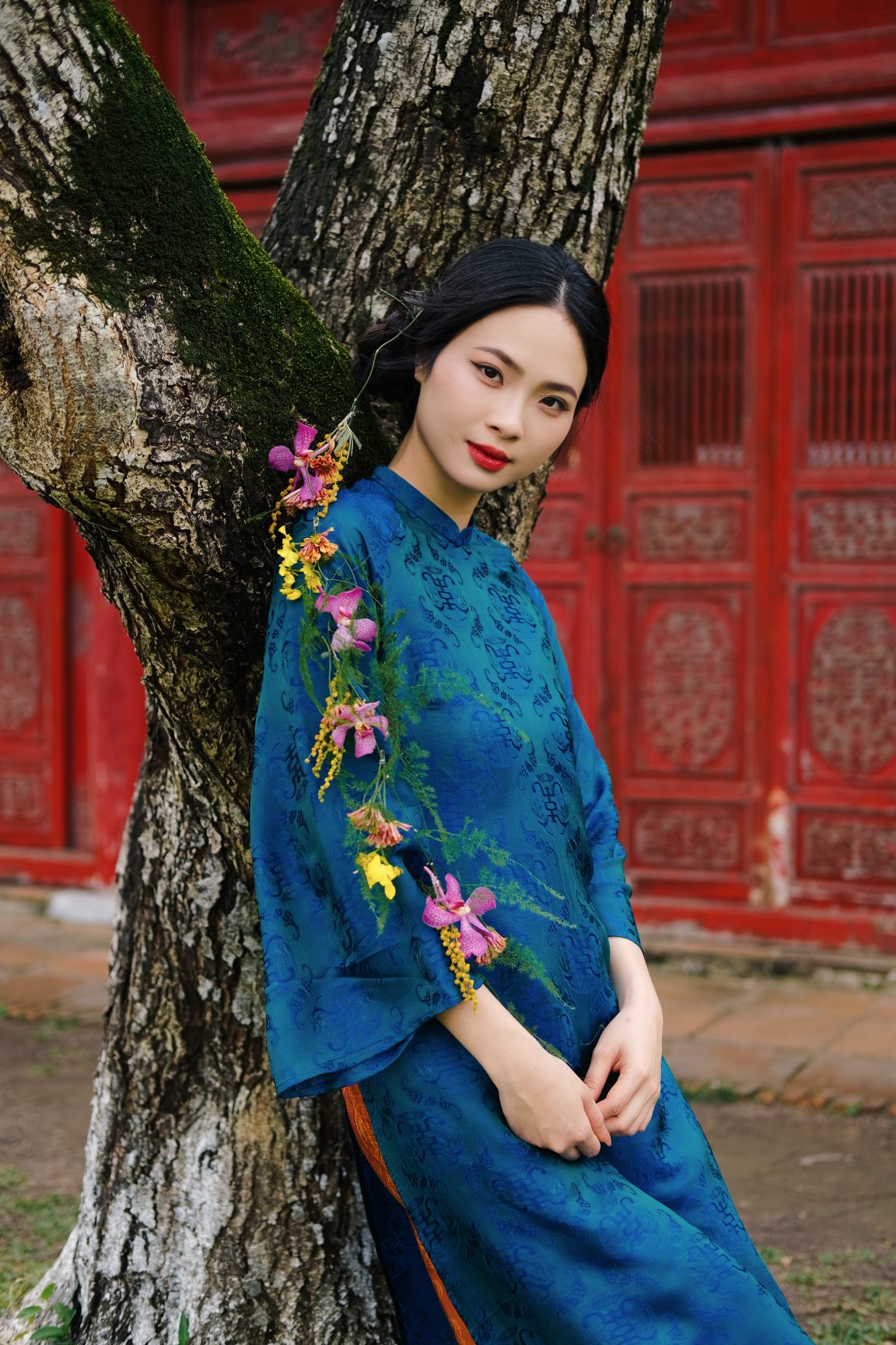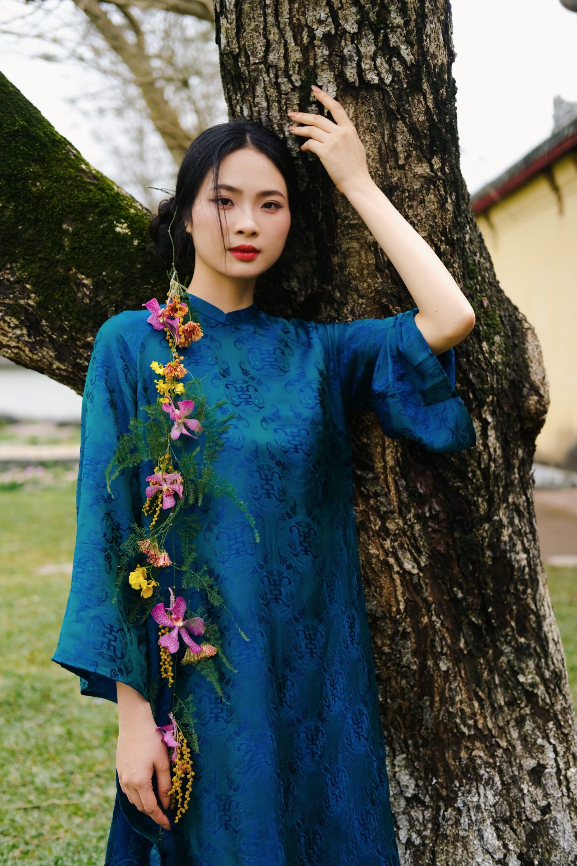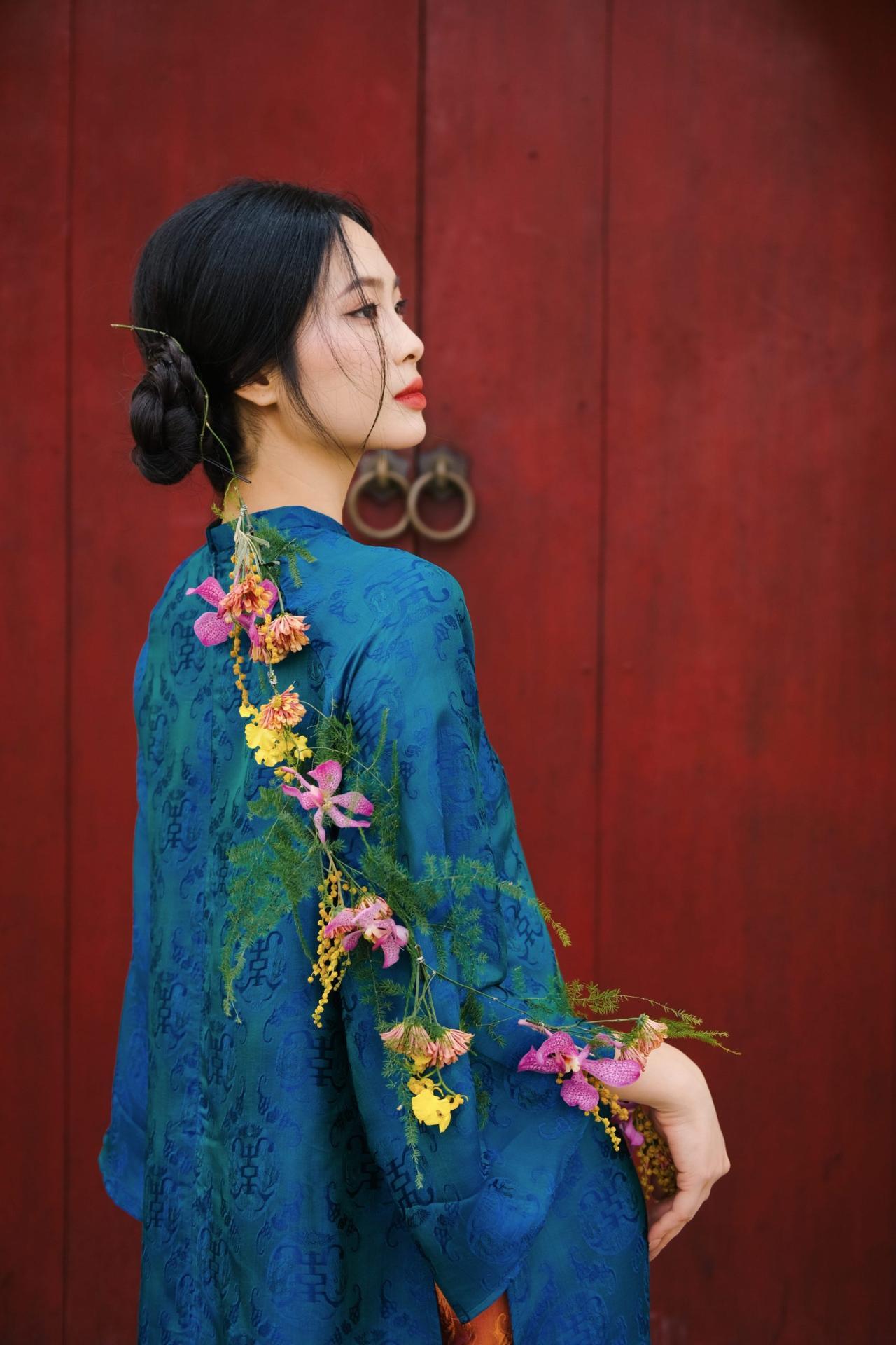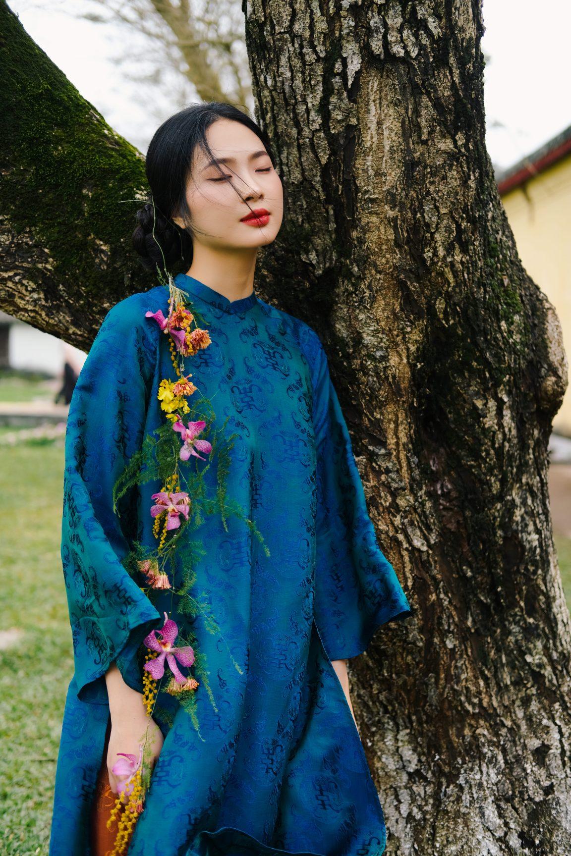 Áo dài tơ tằm hoạ tiết thọ dơi màu xanh vịt – dáng cách tân