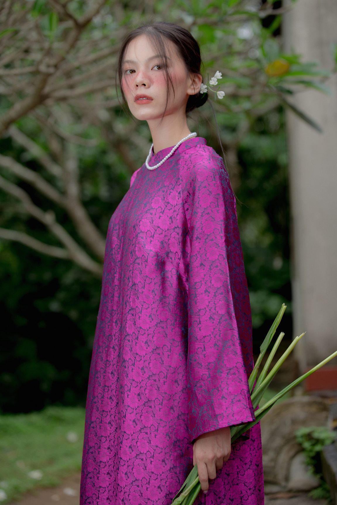Quần lụa tơ tằm hoạ tiết hoa cúc mang cảm giác mềm rơi và thanh thoát, được dệt từ chất lụa tơ tằm mịn màng với độ thoáng nhẹ đặc trưng. Hoạ tiết hoa cúc xuất hiện tinh xảo, tạo điểm nhấn nhẹ nhàng mà vẫn giữ được sự trang nhã của dòng lụa cao cấp.